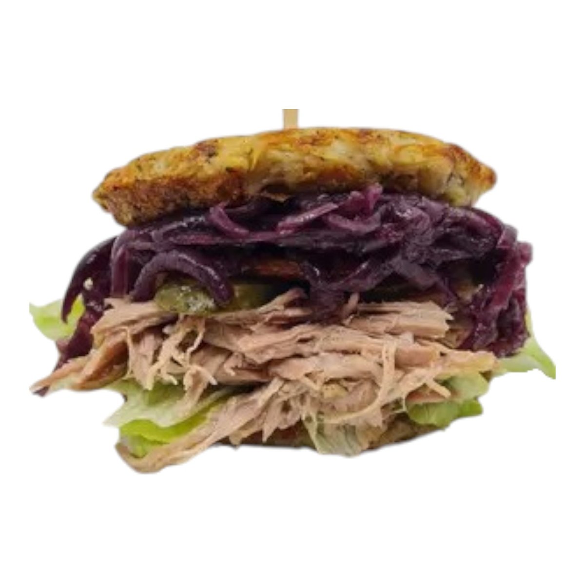 Bramborové placicky, ledový salát, dip, trhané maso, okurka, opečená slanina, cibulové chutney