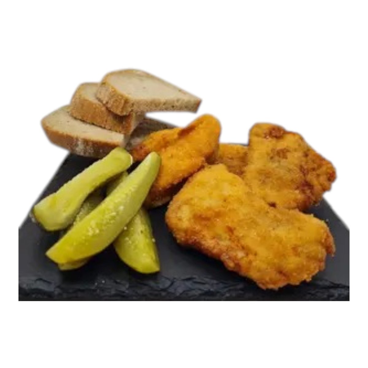 500g vepřových a kuřecích řízečků, okurka, chléb