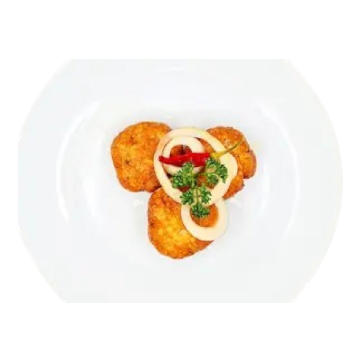 kuřecí maso s tvarůžkama, bramborové placičky, hranolky
