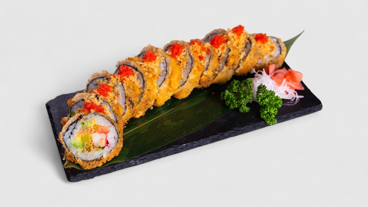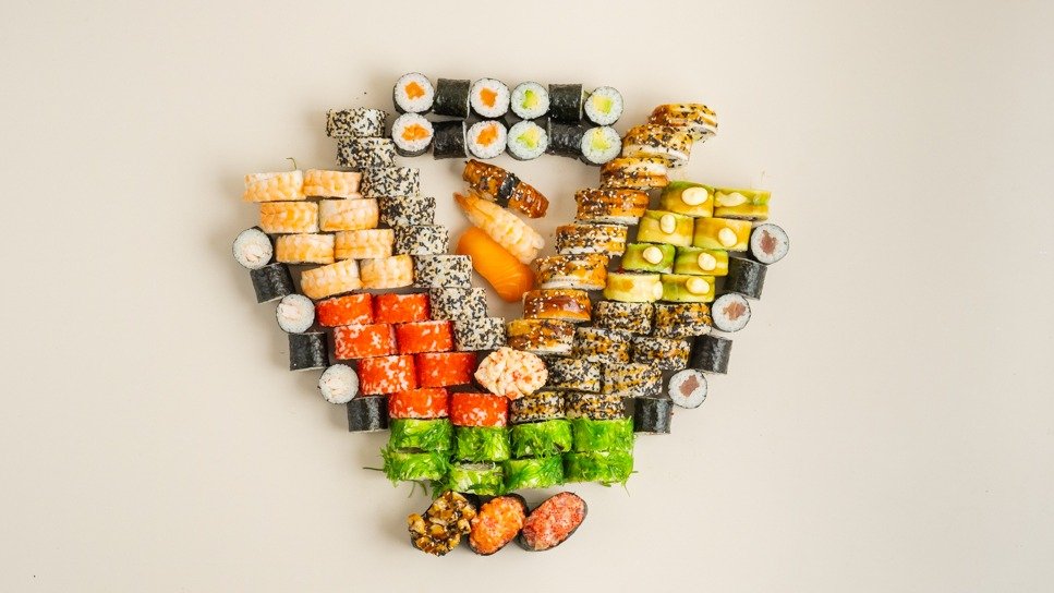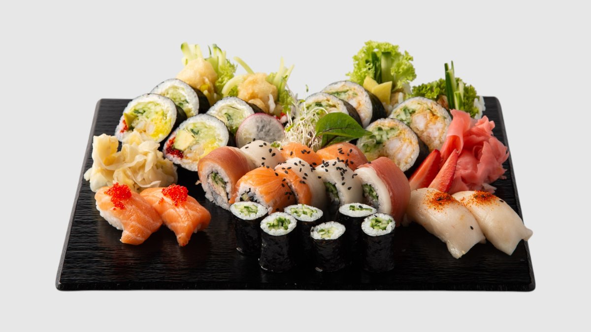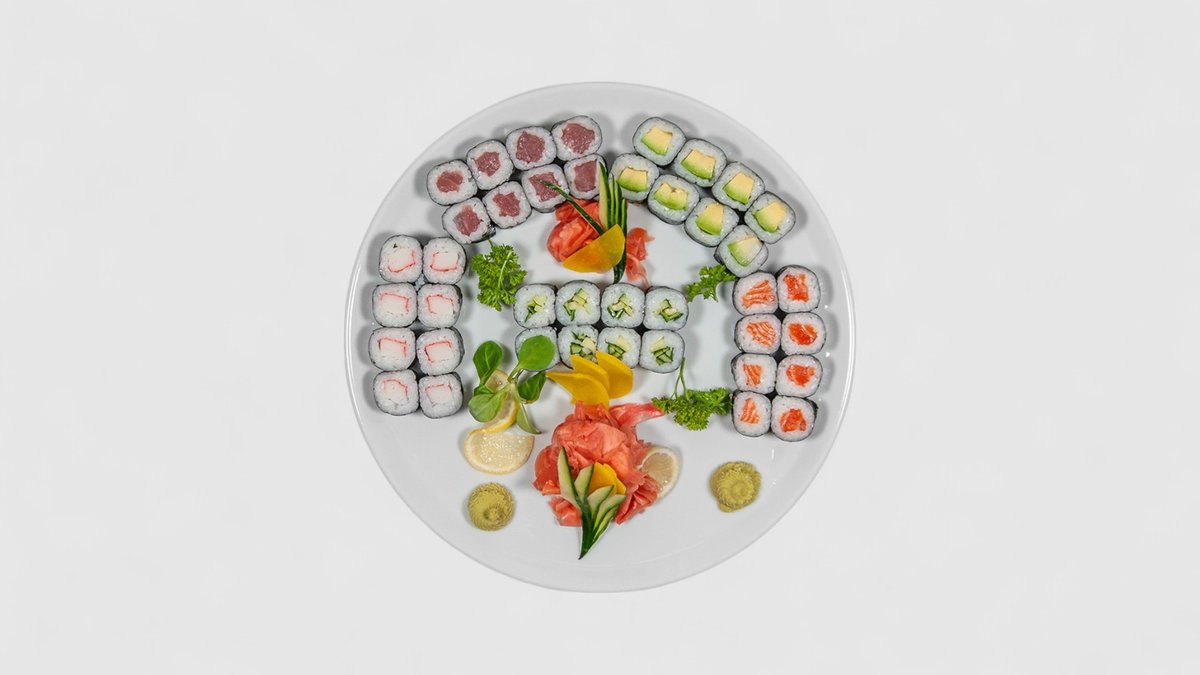 8x maki okurka, 8x maki losos, 8x maki avokádo, 4x nigiri losos, 8x maki smažené krevety, 4x california sezam, 5x futomaki, 4x california tobiko red