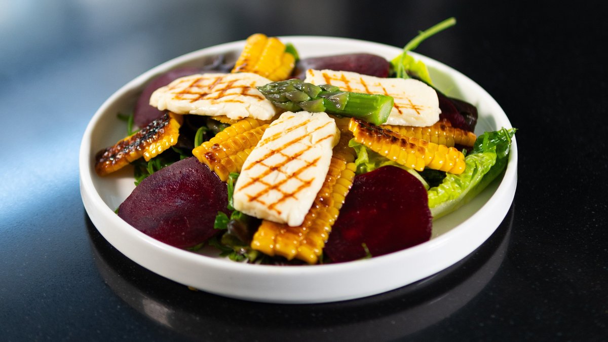 grilovaný sýr, čerstvý salát, šťavnatá kukuřice a citronová zálivka s brusinkami