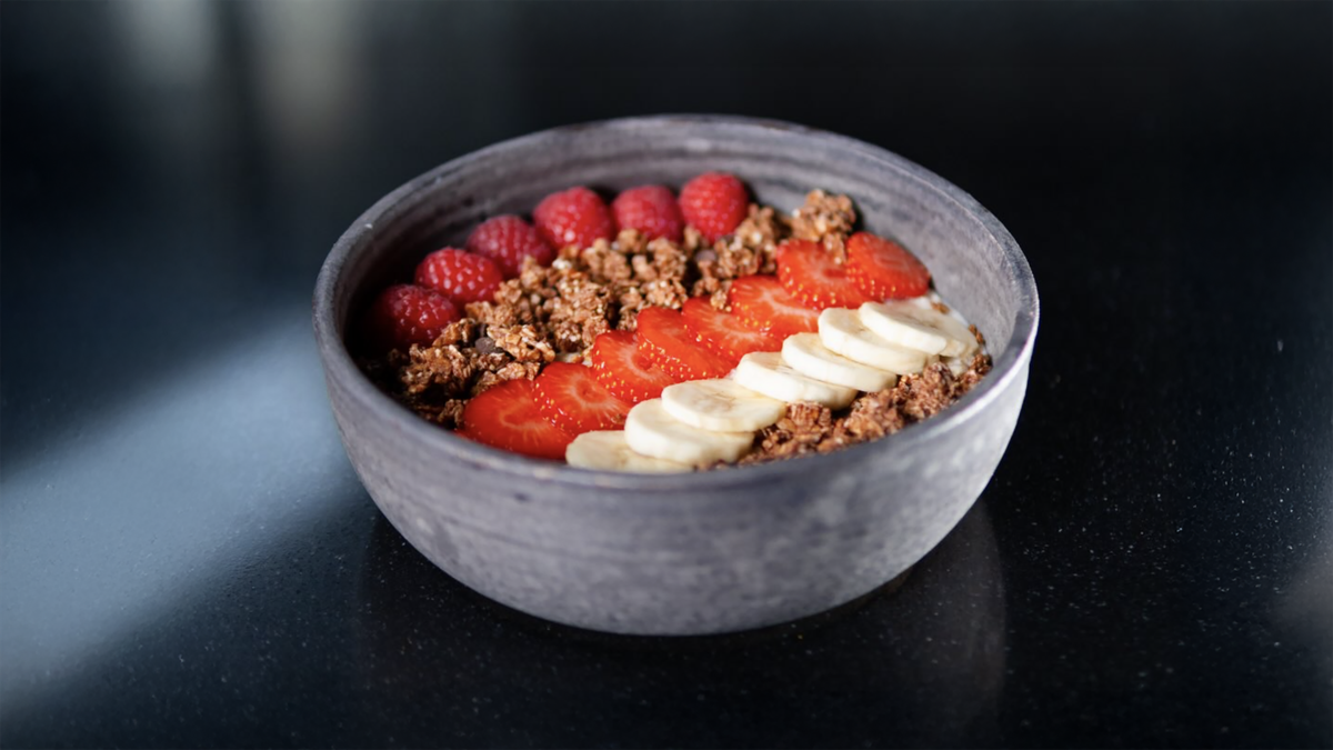 Hřejivá kombinace ovesných vloček vařených v mléce s vanilkou a tonka fazolemi, doplněná jahodami, malinami, banánem, čokoládovým müsli a domácí granolou