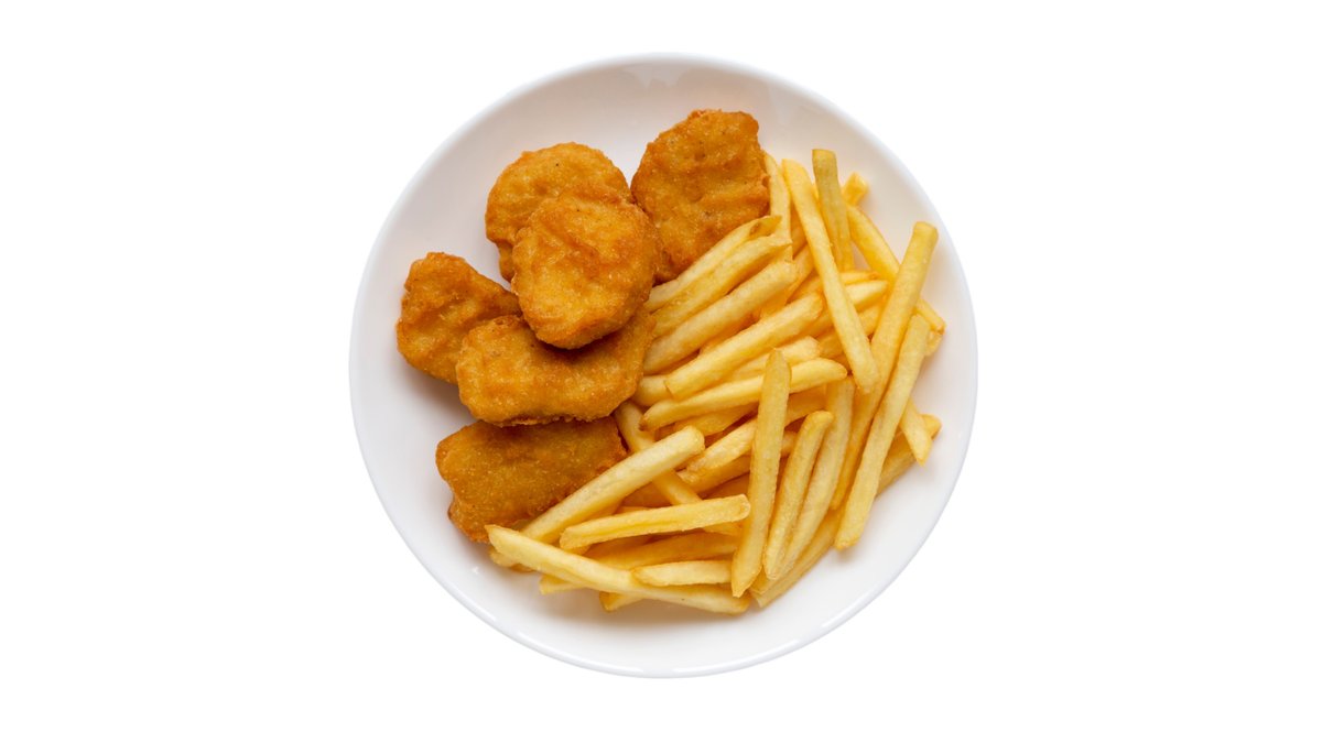 Smažené kuřecí nugetky v těstíčku s hranolky a ďábelskou omáčkou