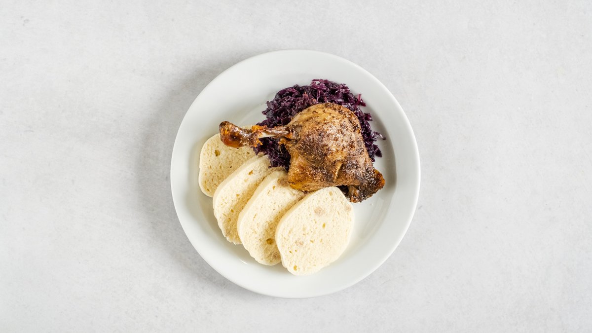 1/4 konfitované kachny, červené zelí, bramborový knedlík