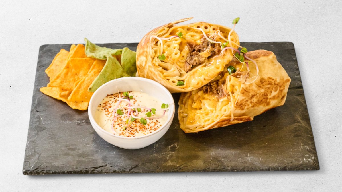 Skvělé menu ideální na sdílení. Krémové Mac & Cheese (450 g), k tomu jeden wrap napůl – vyberte si mezi variantou s hovězím masem nebo s kuřecími stripsy – a nechybí ani dvě vychlazené Coca-Coly.