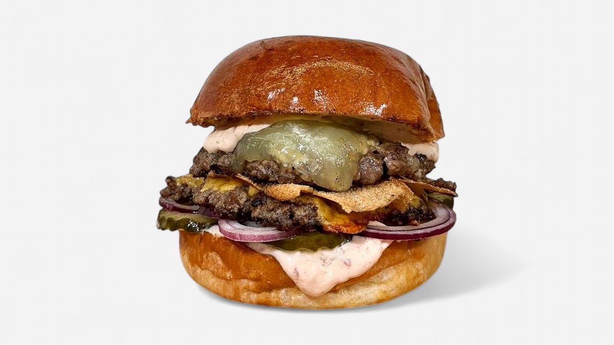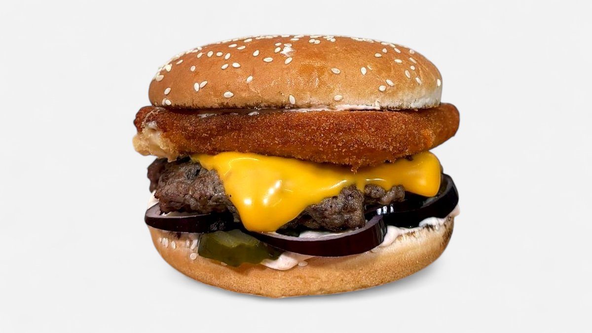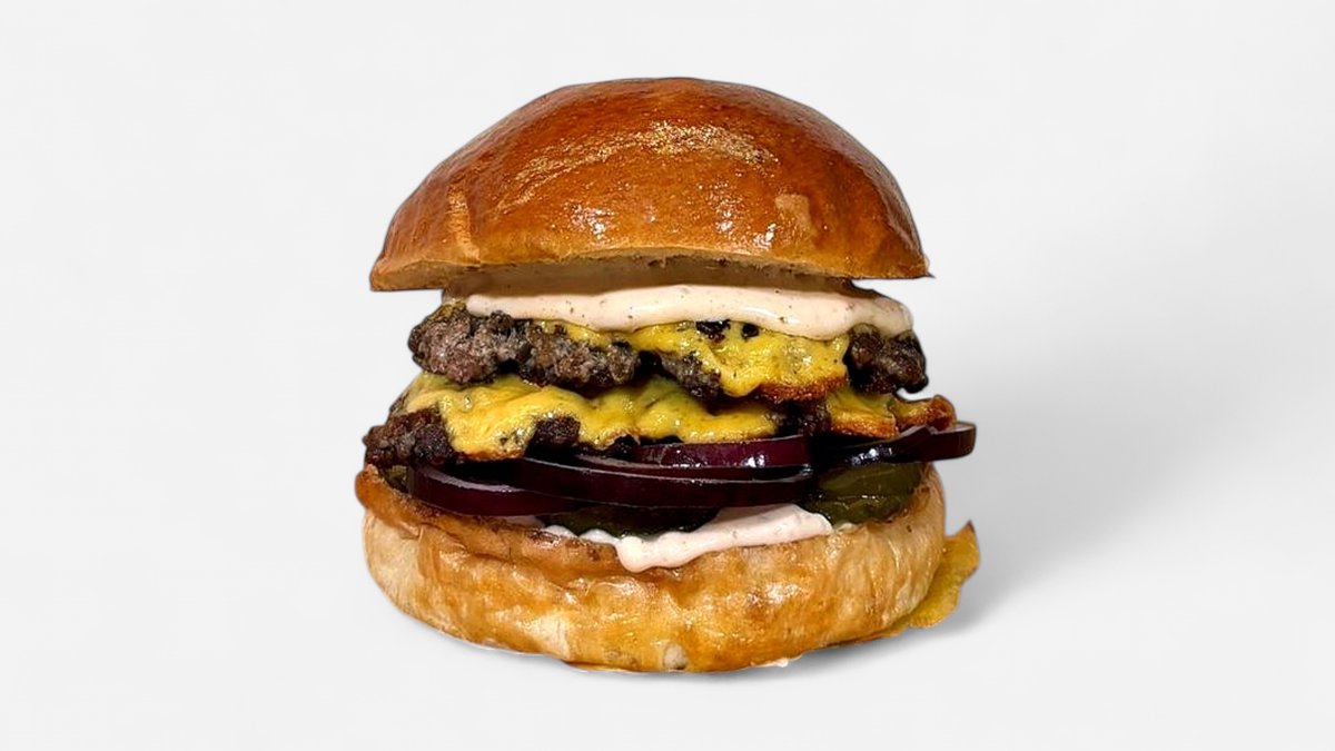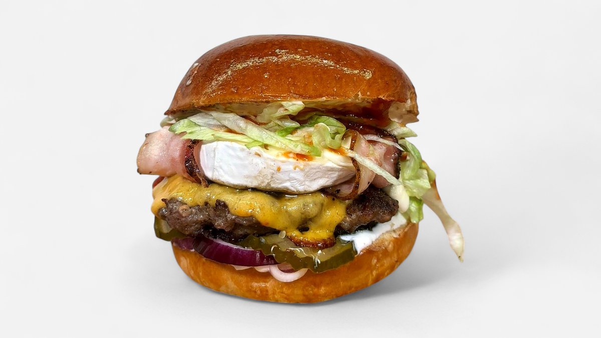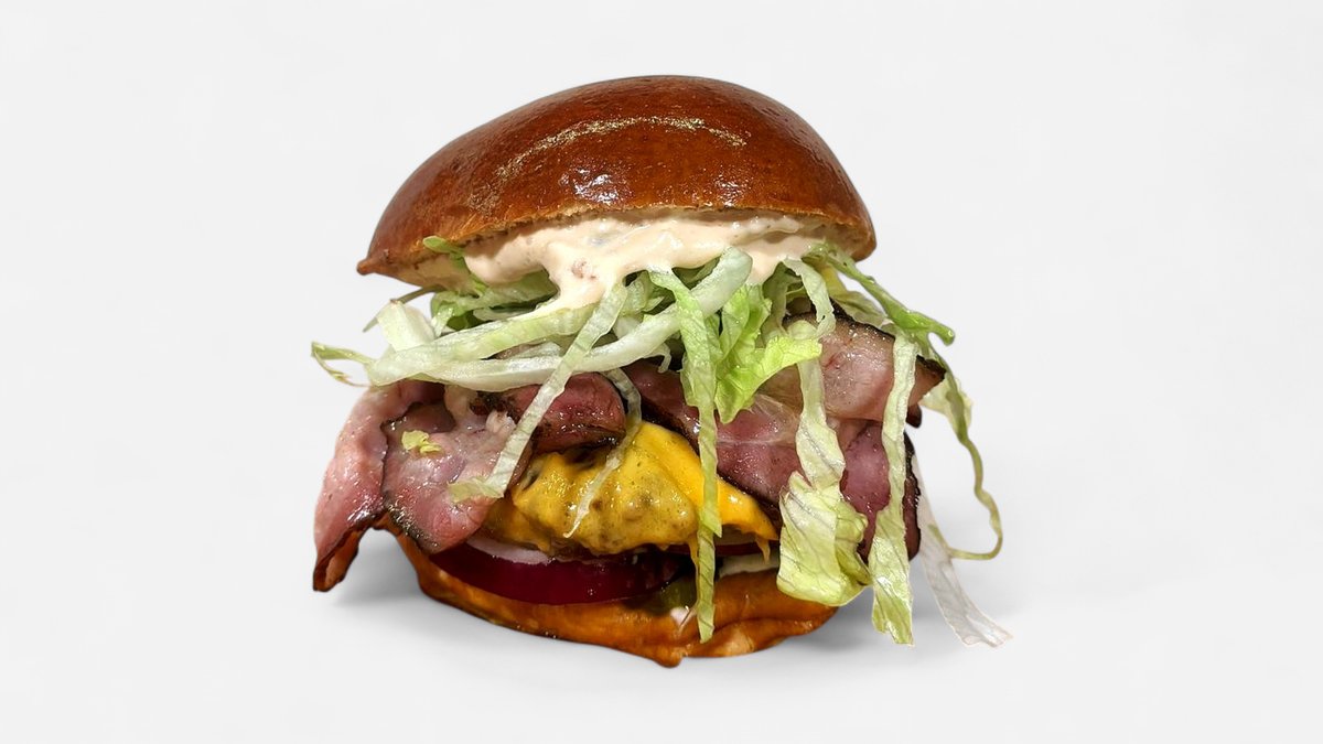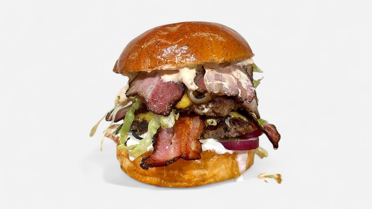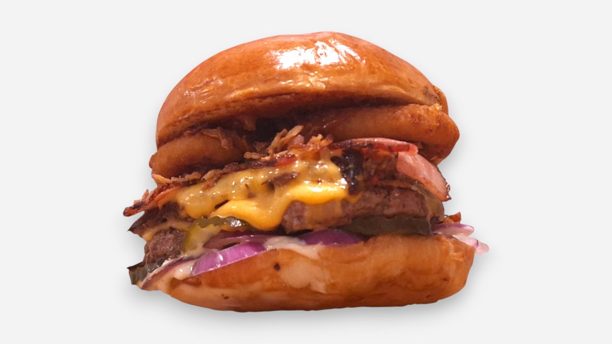 Máslová brioška, 2x 100g hovězí smash, 2x cheddar, 3x cibulové kroužky, 2x domácí slanina, vysmažená cibulka, domací tatarka a naše BBQ.