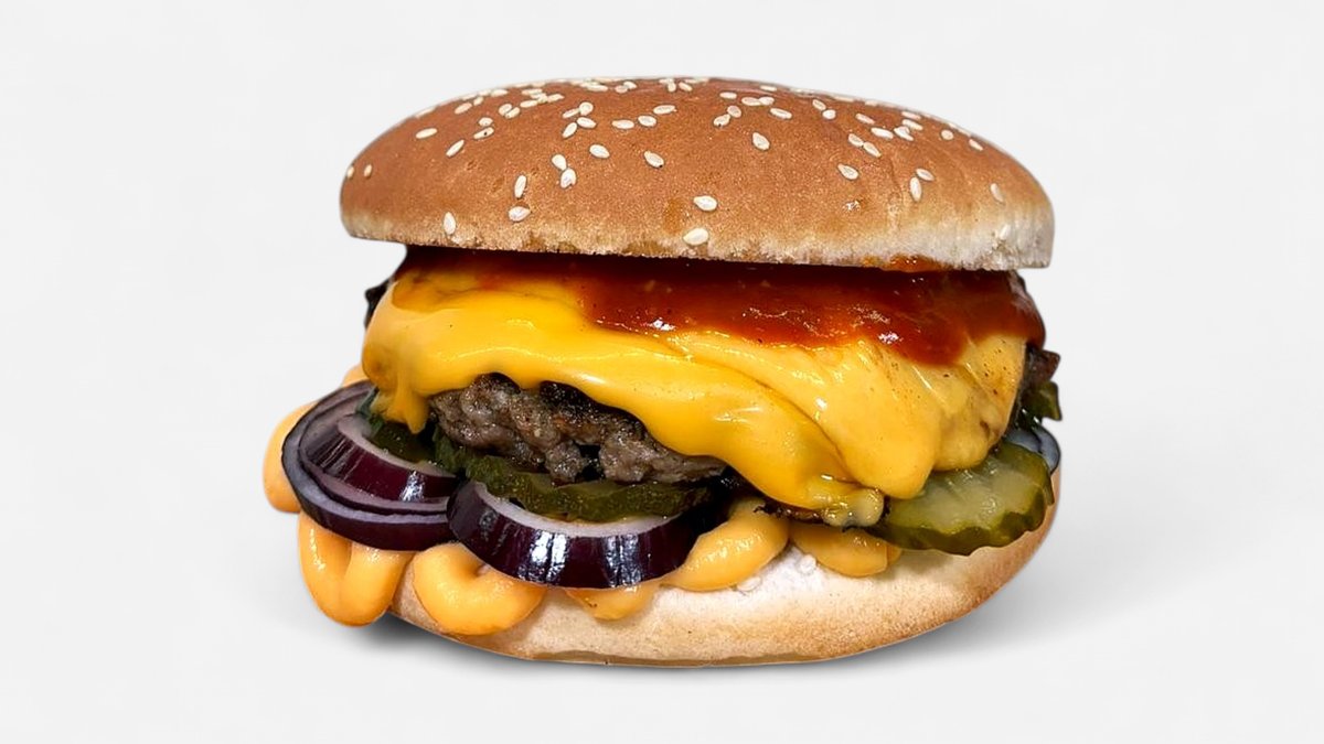 150 gramů hovězího masa, 2xplátek cheddaru, cibule, okurek, hořčice, kečup. Klasika kterou můžeš pořád.