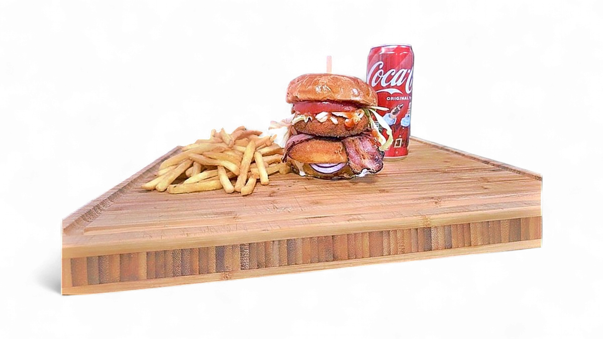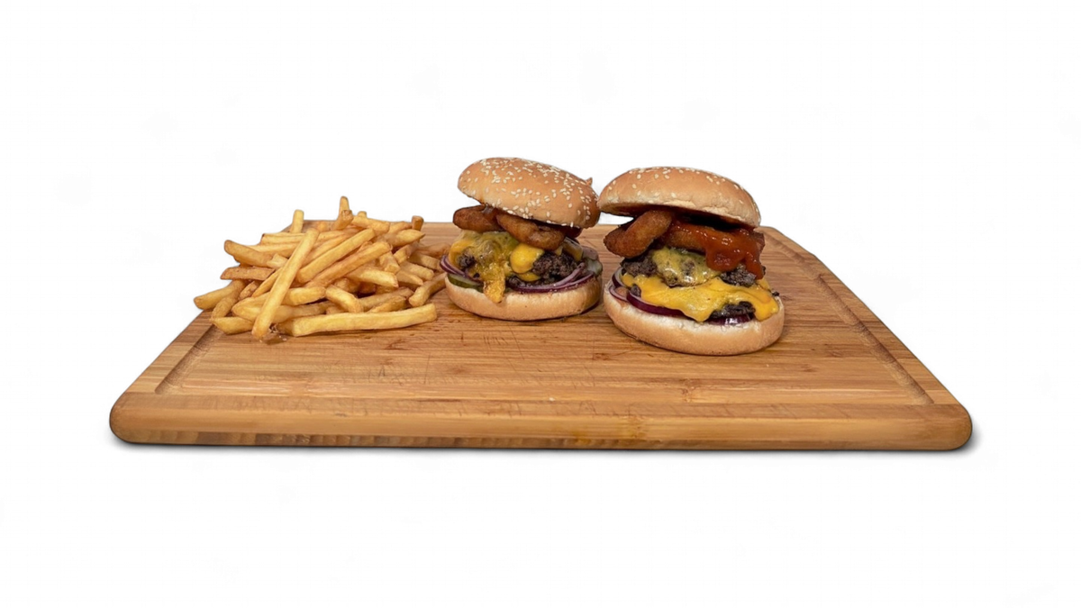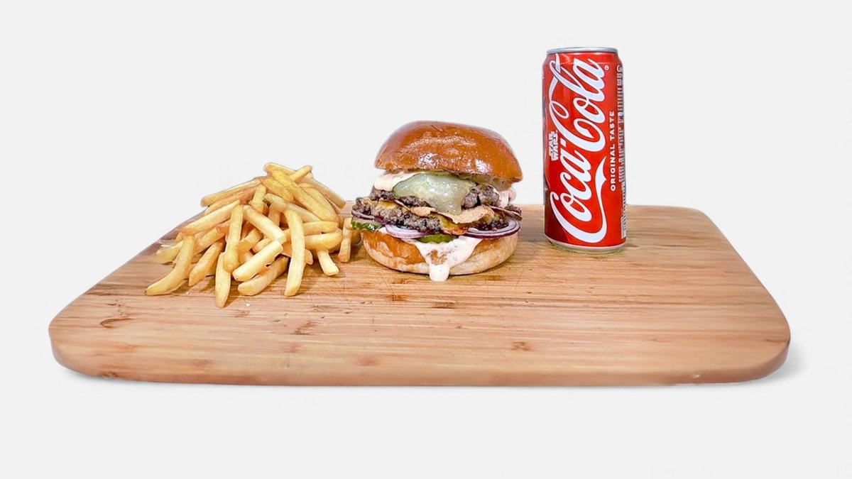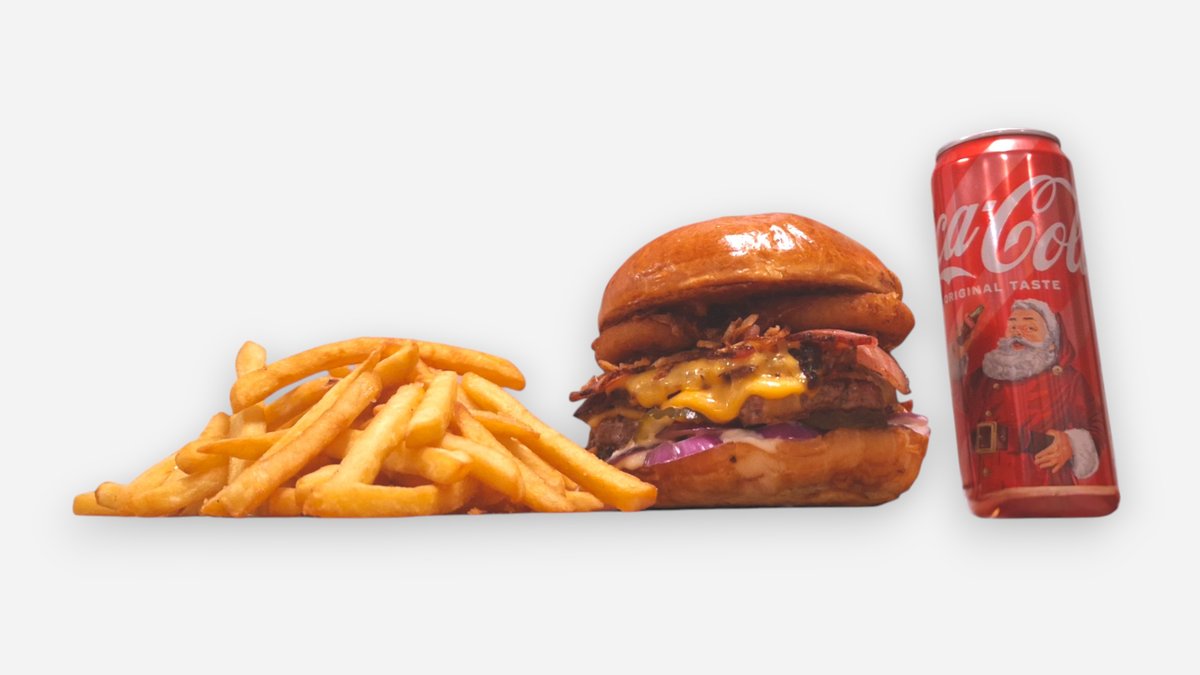 Máslová brioška, 2x 100g hovězí smash, 2x cheddar, 3x cibulové kroužky, 2x domácí slanina, vysmažená cibulka, domací tatarka a naše BBQ. Porce hranolek a Coca-cola.