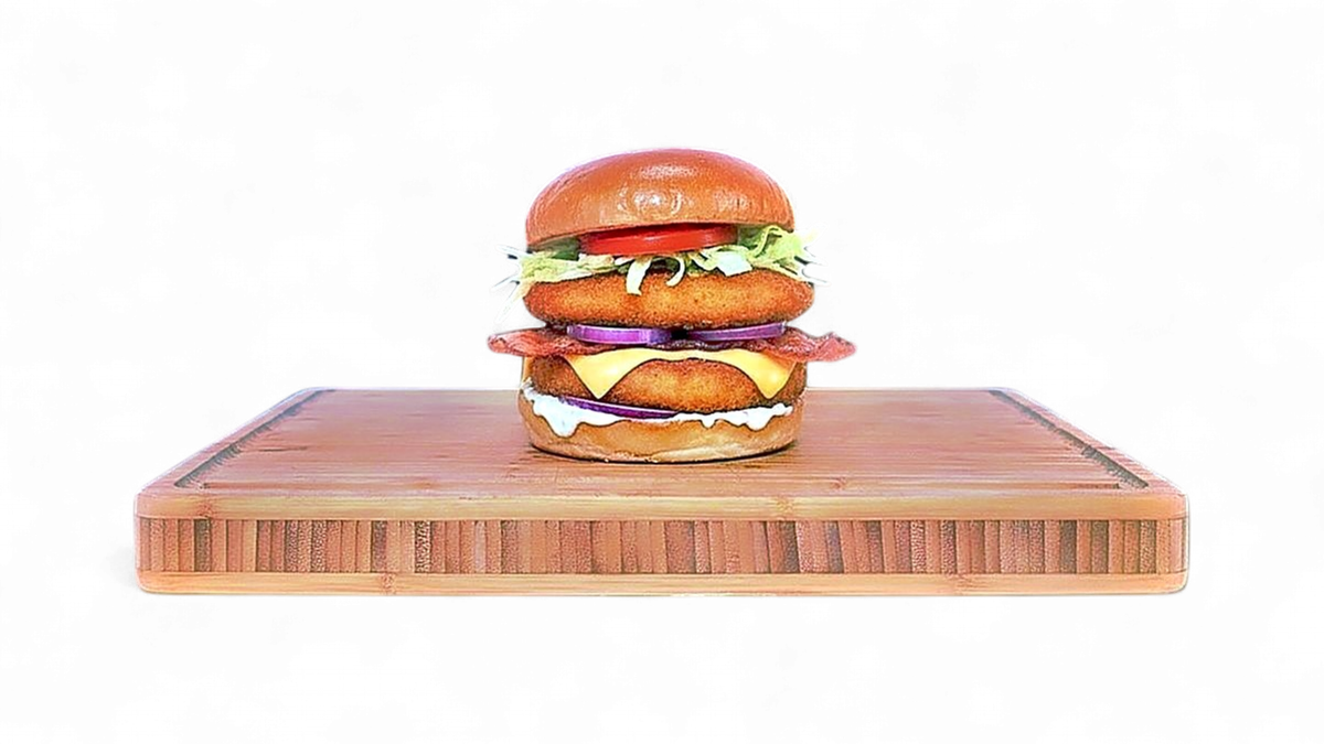 150g hovězího masa, Smažený sýr, 1x plátek cheddaru, slaninová omáčka, cibule a okurek. Pro milovníky smažáků a hovězího vše v jednom.