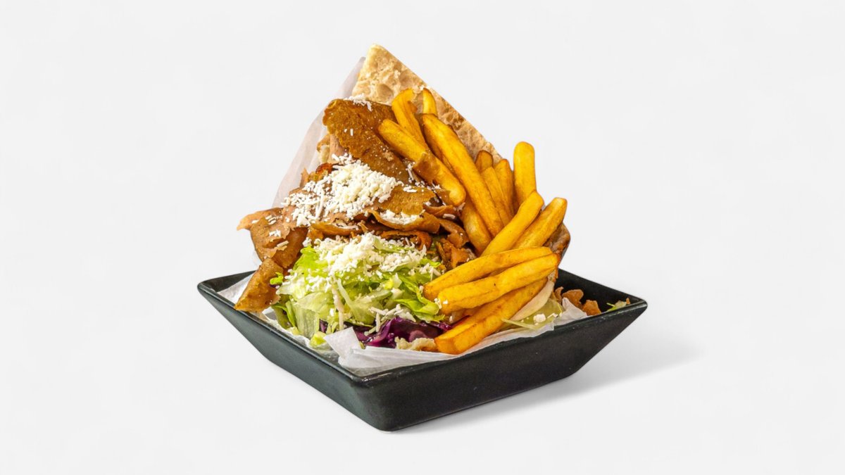 maso, salát, hranolky, dresink, na výber malý / velký kebab box