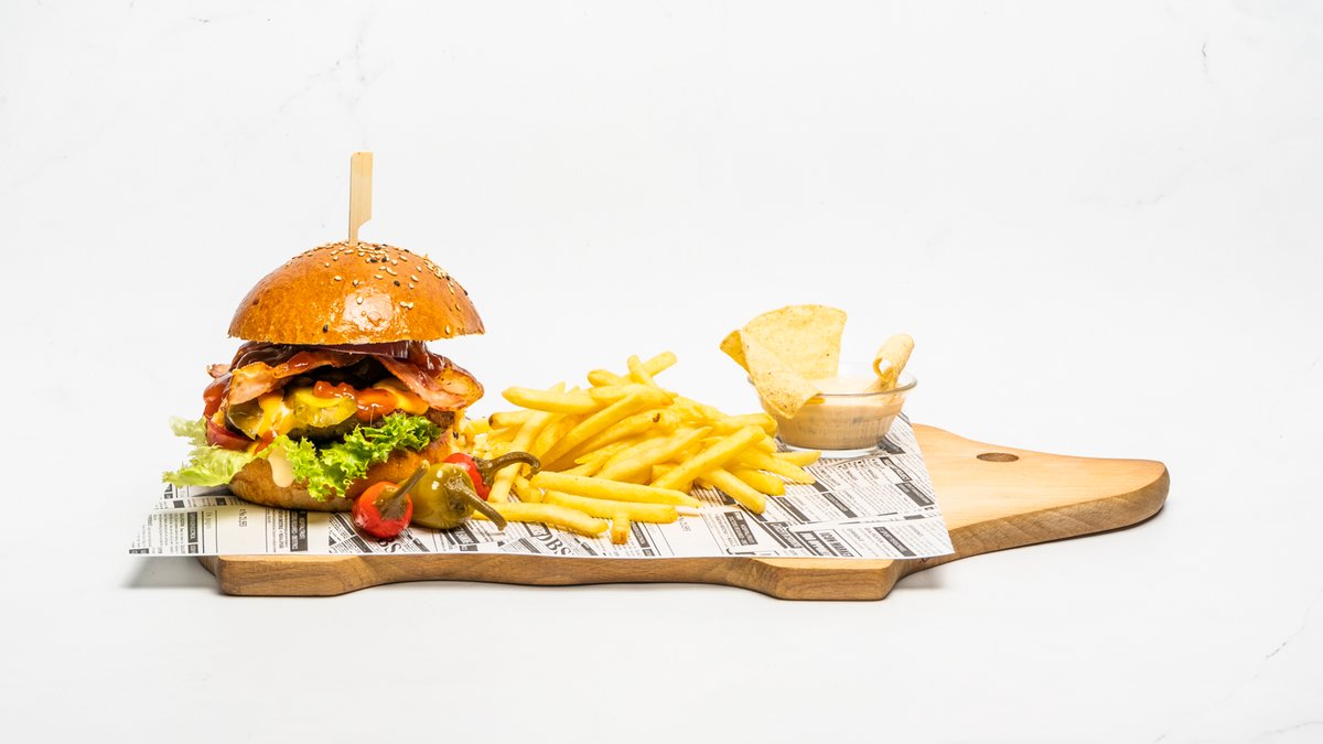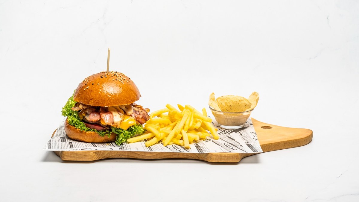 Bacon burger 180g (hovězí maso, slanina, salát, okurka, rajče, uzená majonéza, čedar, hranolky)