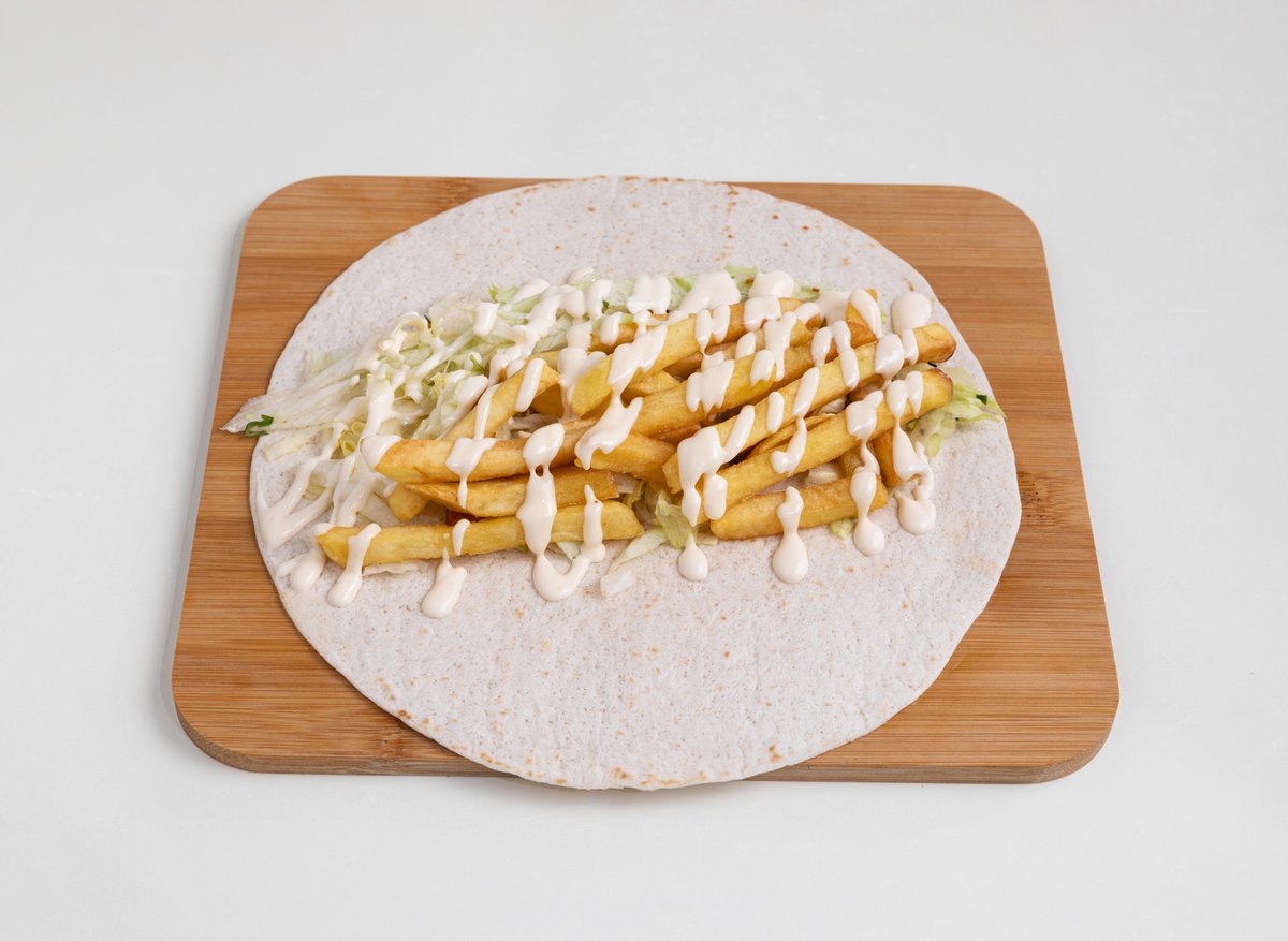 křupavé smažené prso, ledový salát, majonéza, wrap a porce domacích hranolek