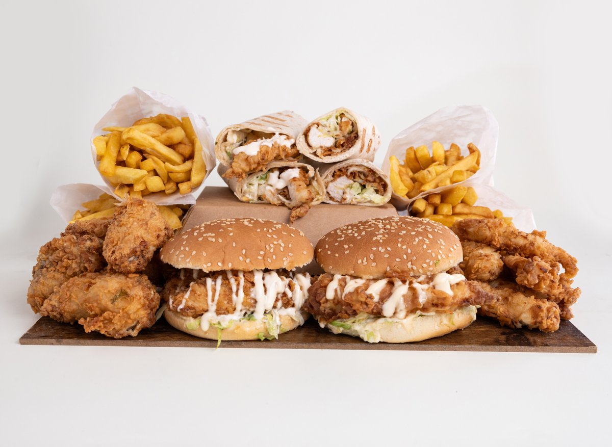 2x Strip burger, 2x wrap, 6x wings, 5 strips, 4x porce hranolek a 1,5l nápoj