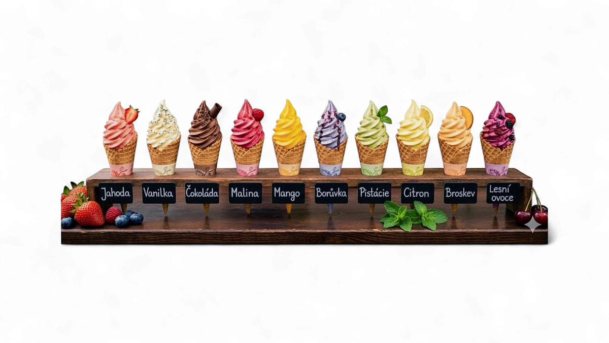 Vždy čerstvě natočená zmrzlina. Dvě příchutě, které se časem mění. Tři možnosti natočení. Vyber si a nezapomeň ochutnat všechny příchutě.