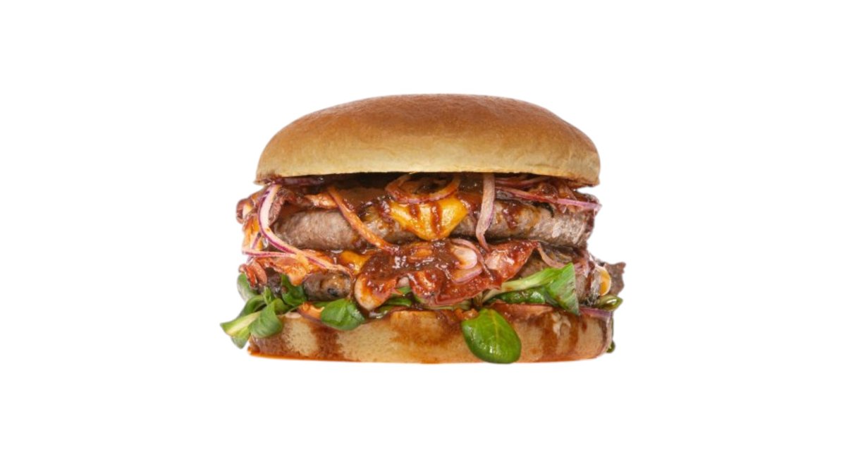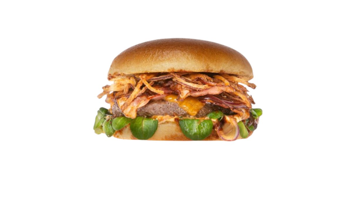 Máslová brioška, 100% hovězí maso, majonéza, BBQ omáčka, 2x čedar, 2x slanina, karamelizovaná cibulka, červená cibulka, polníček + 1x voda zdarma, příloha dle výběru