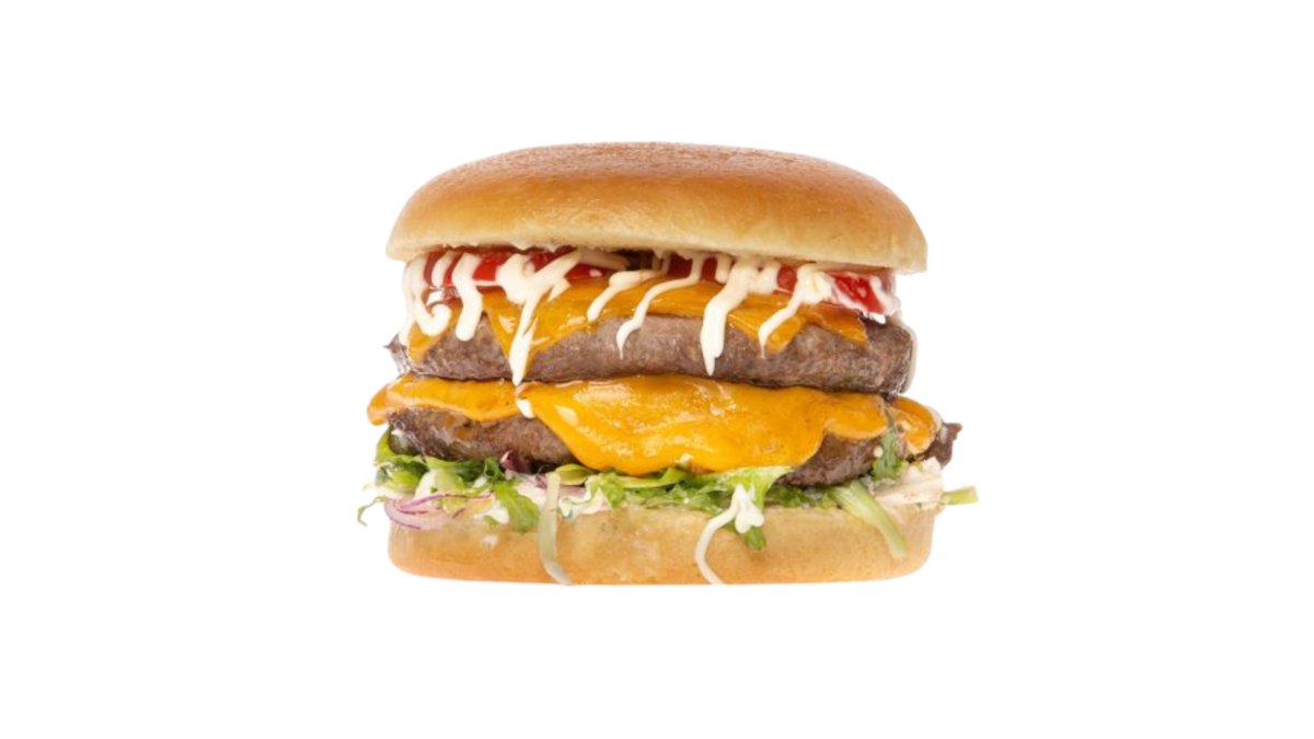 Máslová brioška, 2x 100% hovězí maso, majonéza, 4x čedar, 2x rajče, červená cibulka, ledový salát + 1x voda zdarma, příloha dle výběru