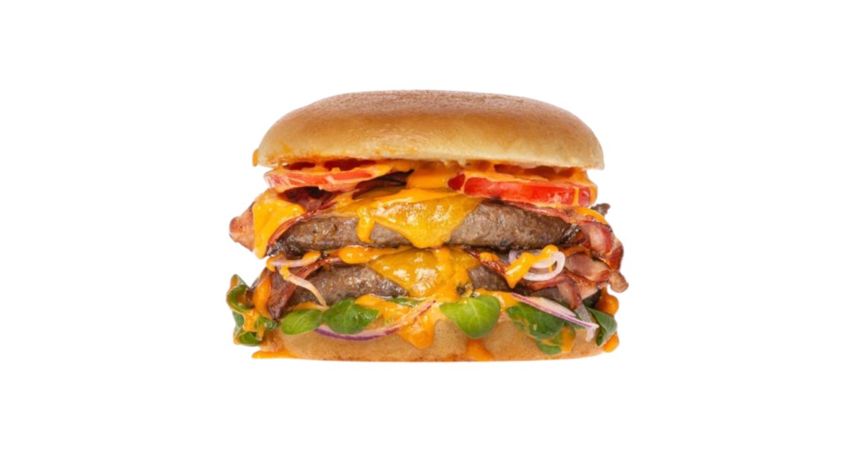 Máslová brioška, 2x 100% hovězí maso, majonéza, Mississippi omáčka, 2x čedar, 4x slanina, červená cibulka, 2x rajče, polníček + 1x voda zdarma, příloha dle výběru