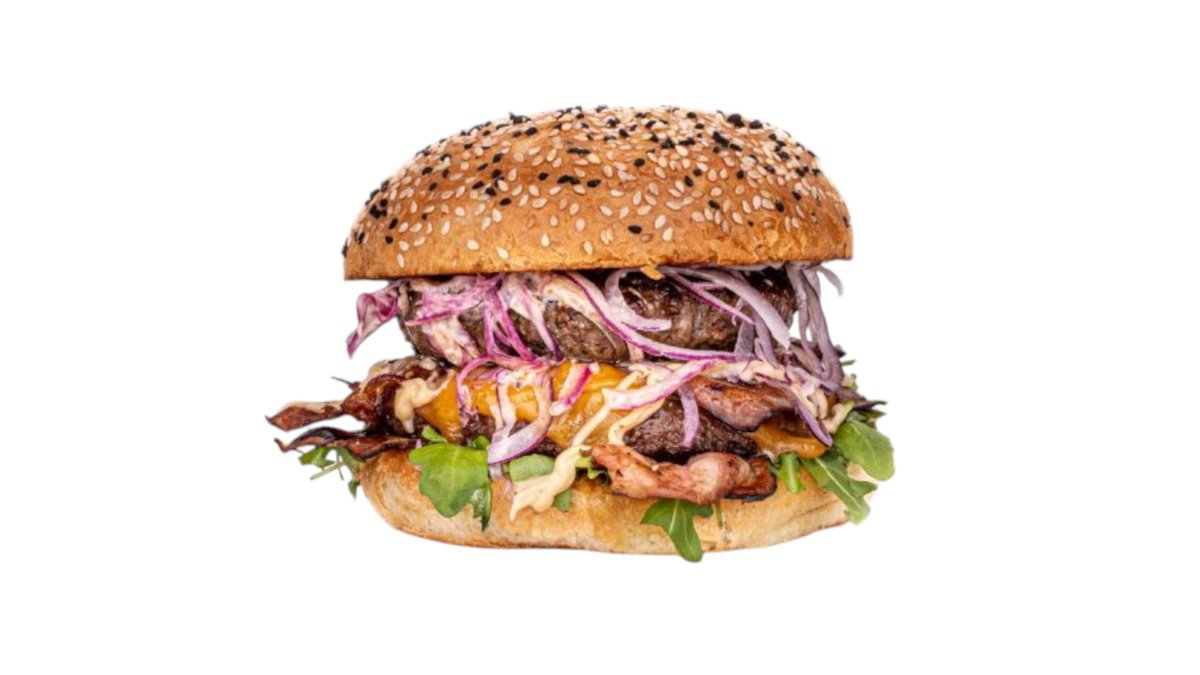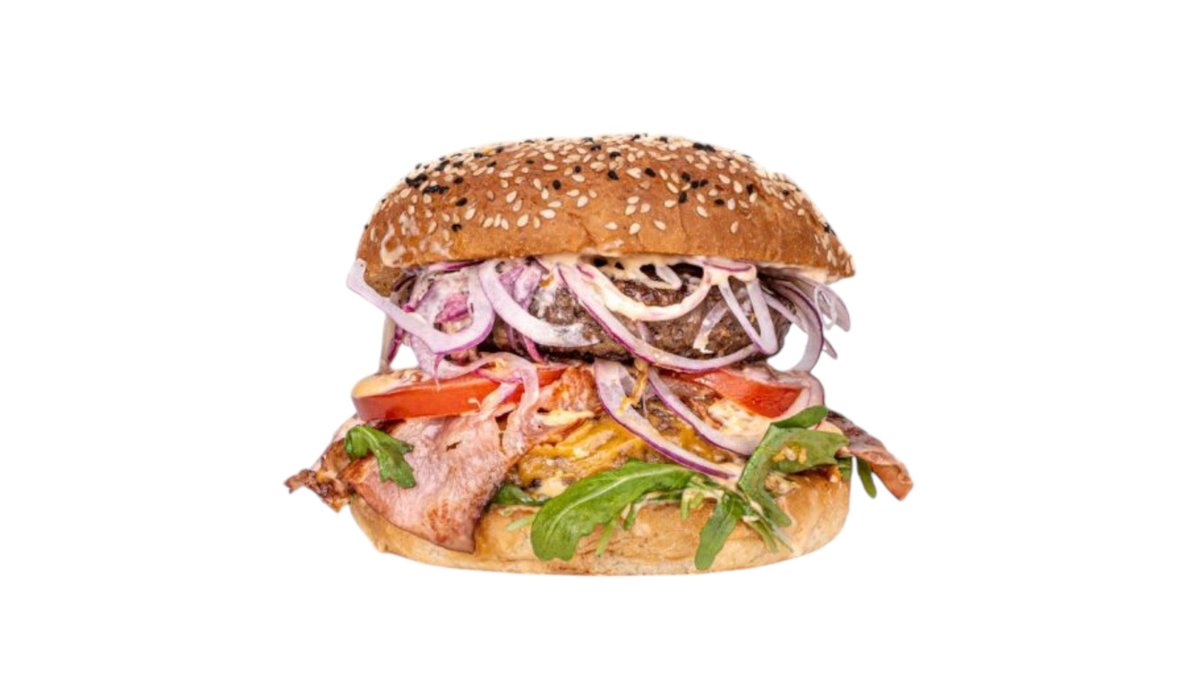 Bulka se sezamem a černým kmínem, 2x 100% hovězí maso, Pepřová omáčka, červená cibulka, rukola, 2x čedar, 4x slanina + 1x voda zdarma, příloha dle výběru