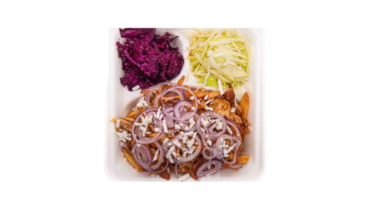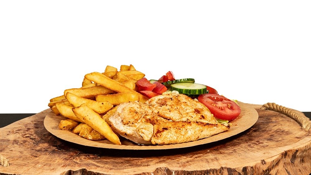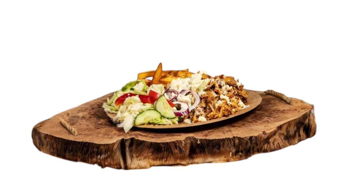 Kuřecí gyros, salát coleslaw, červená cibule, balkánský sýr, hranolky, omáčka jogurtovo-česneková, zeleninová obloha