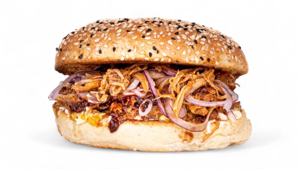 Brioška se sezamem a černým kmínem, salát coleslaw, výběr trhaného masa, červená cibulka, salát, chipottle omáčka