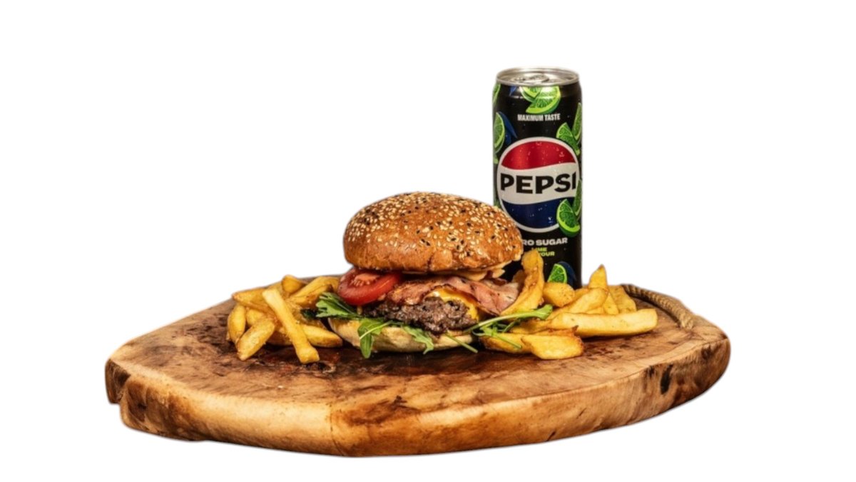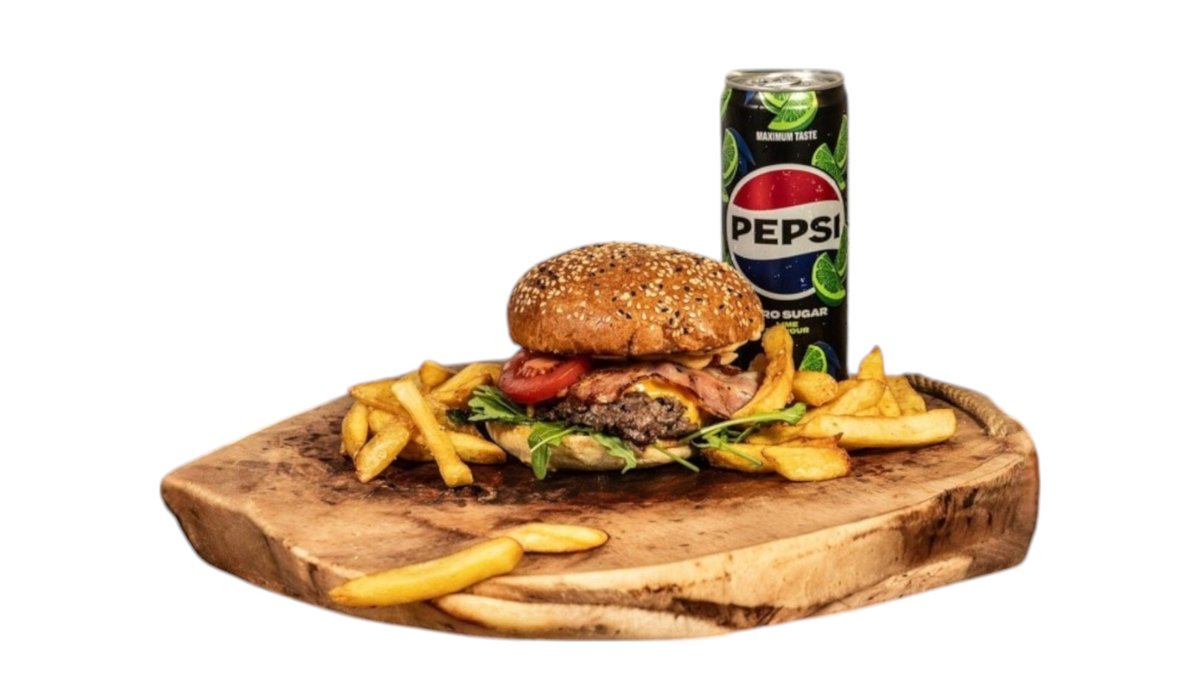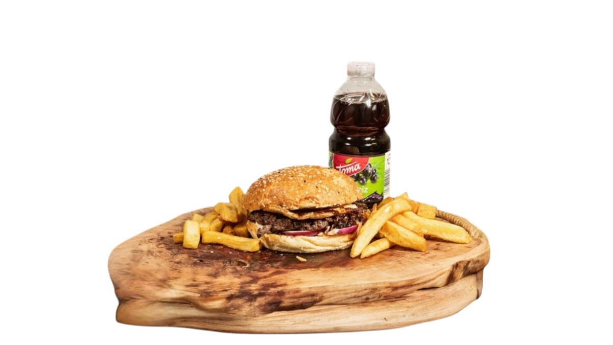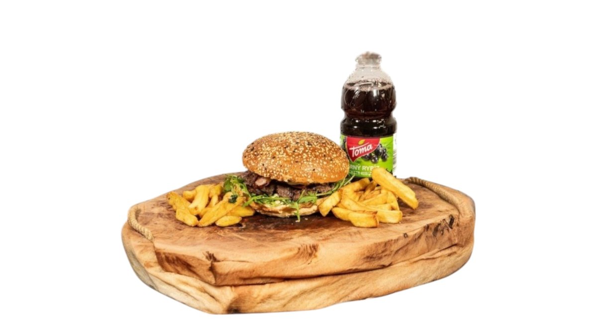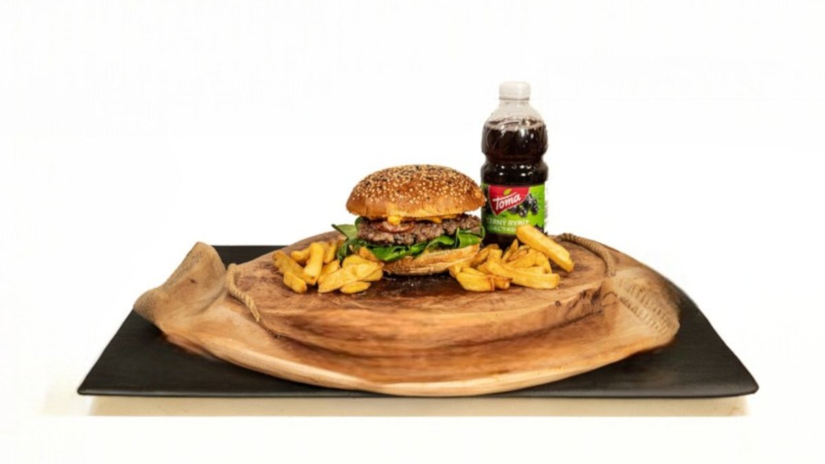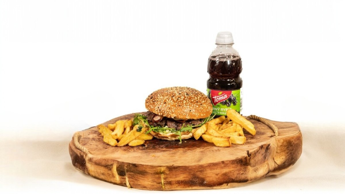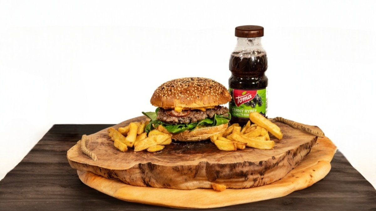 Máslová bulka, hovězí maso, čedar, ledový salát, rajče, majonéza, hranolky, omáčka a nápoj dle výběru