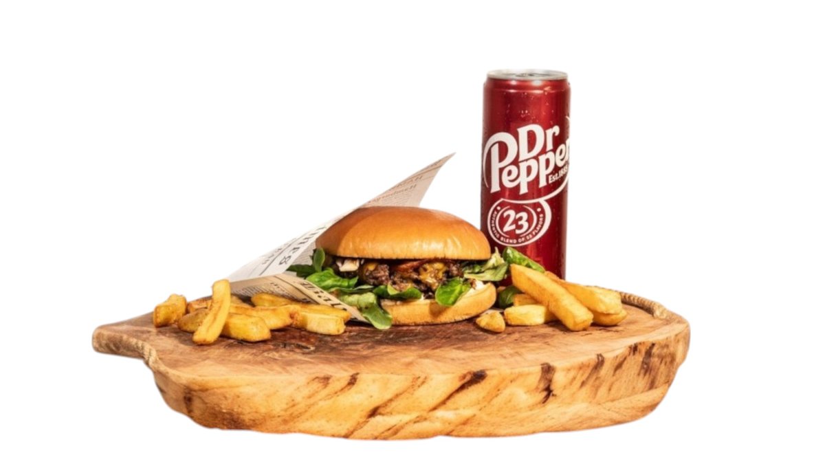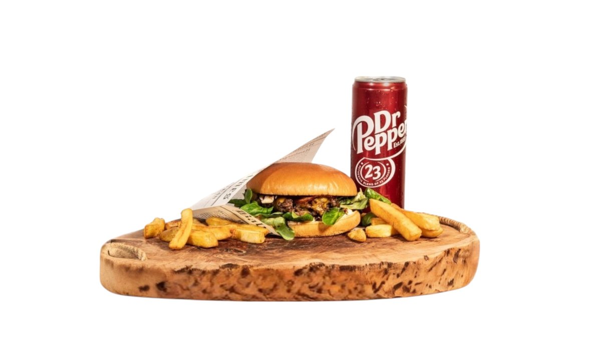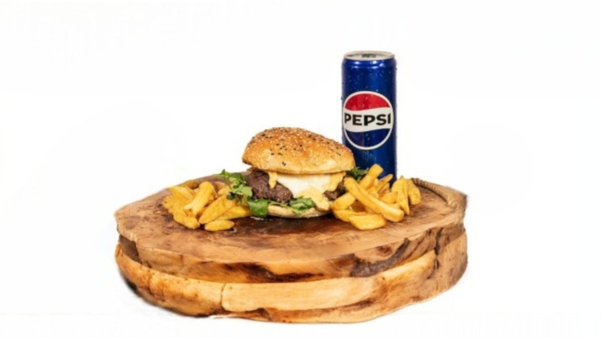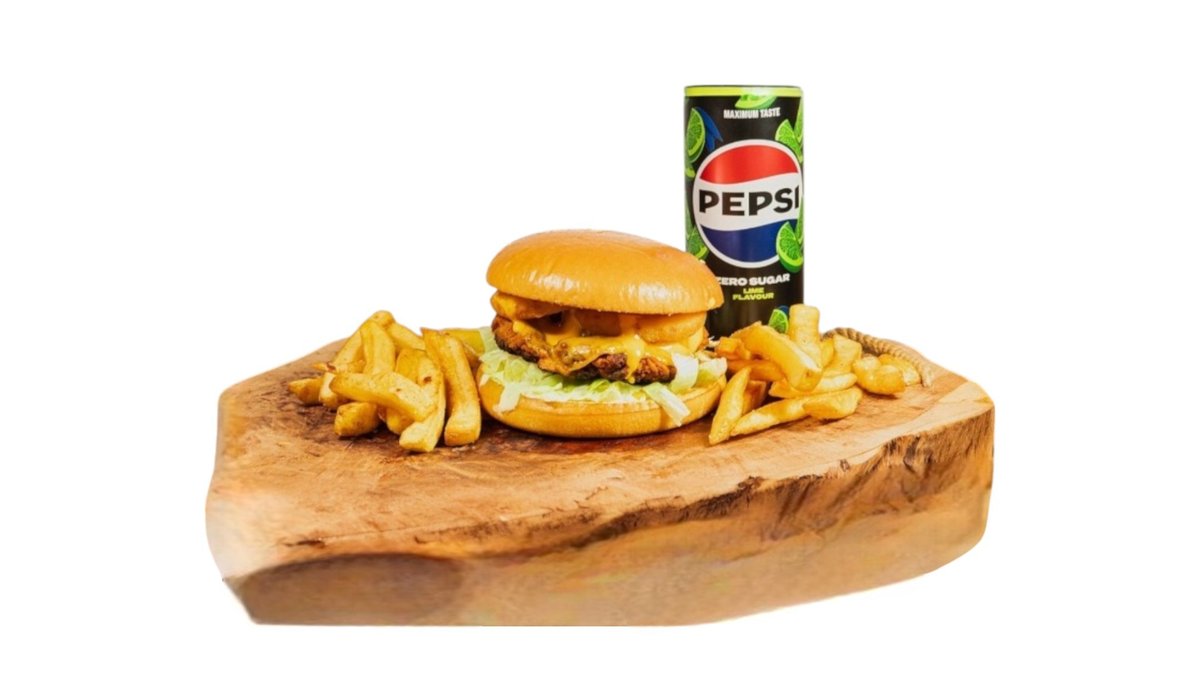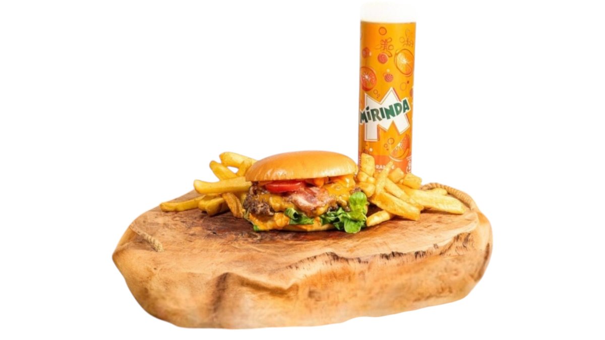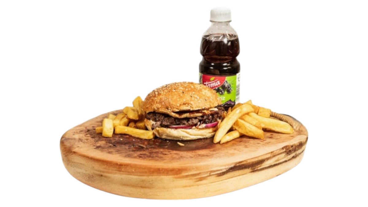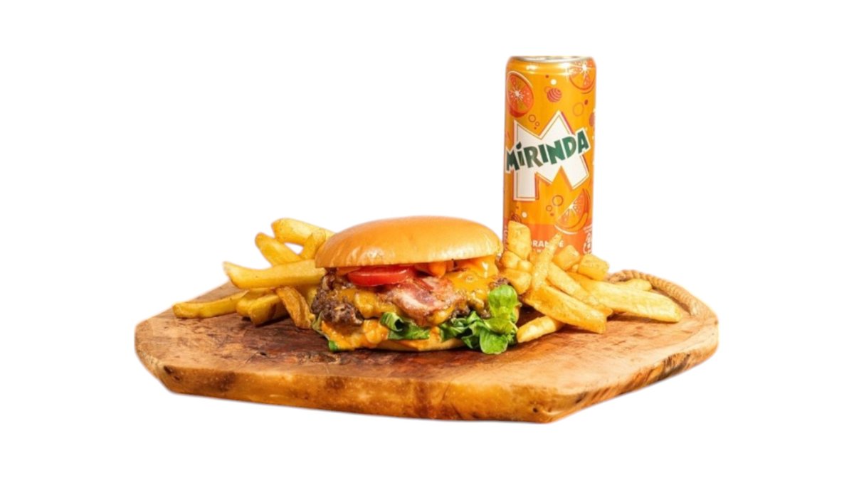 Máslová bulka, hovězí maso, čedar, ledový salát, rajče, majonéza, hranolky, omáčka a nápoj dle výběru