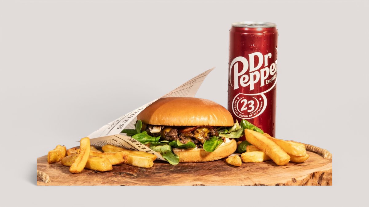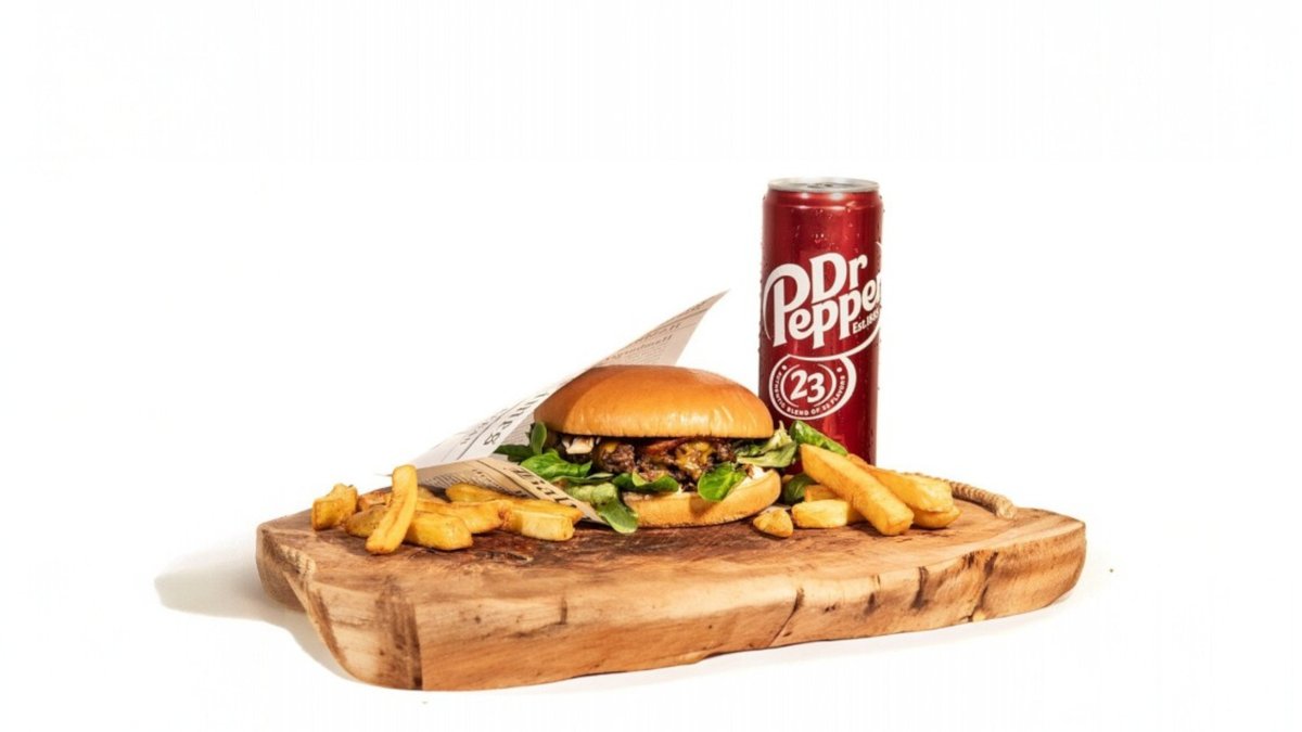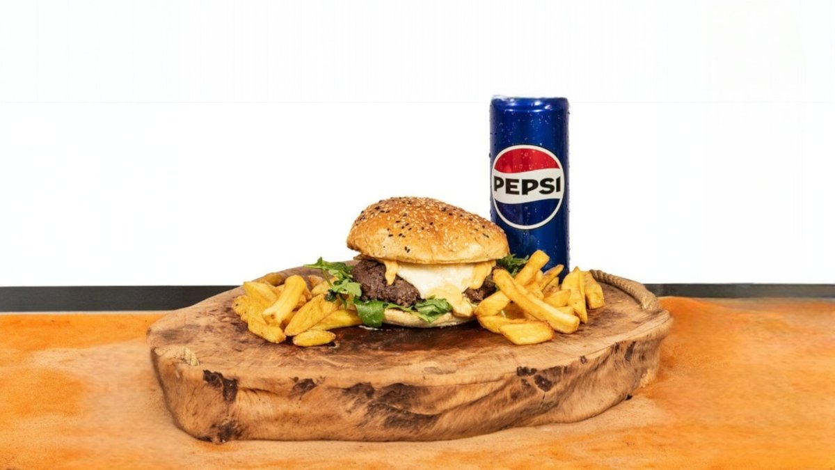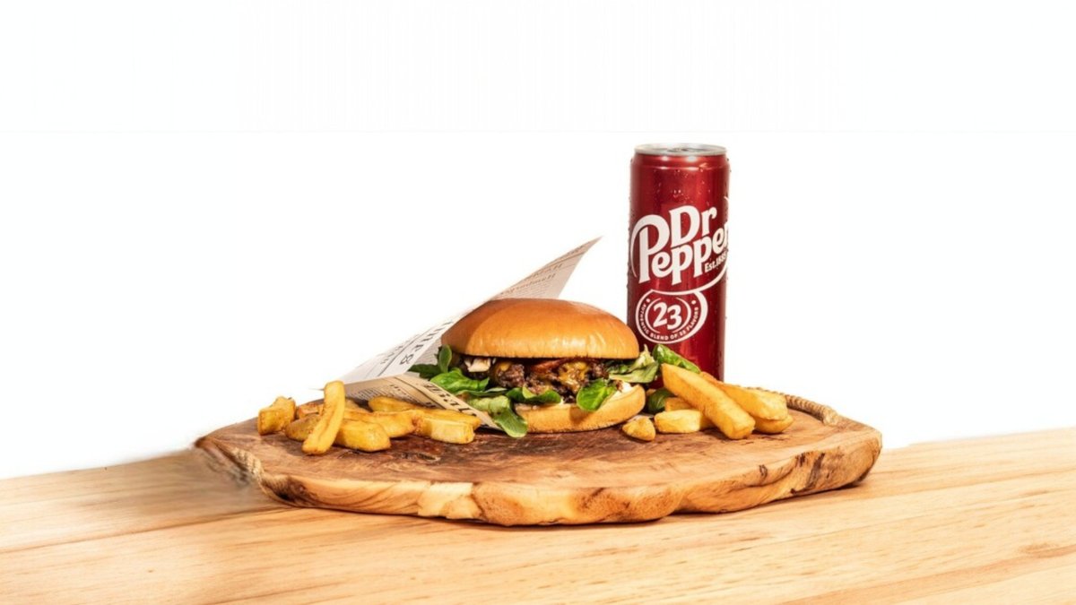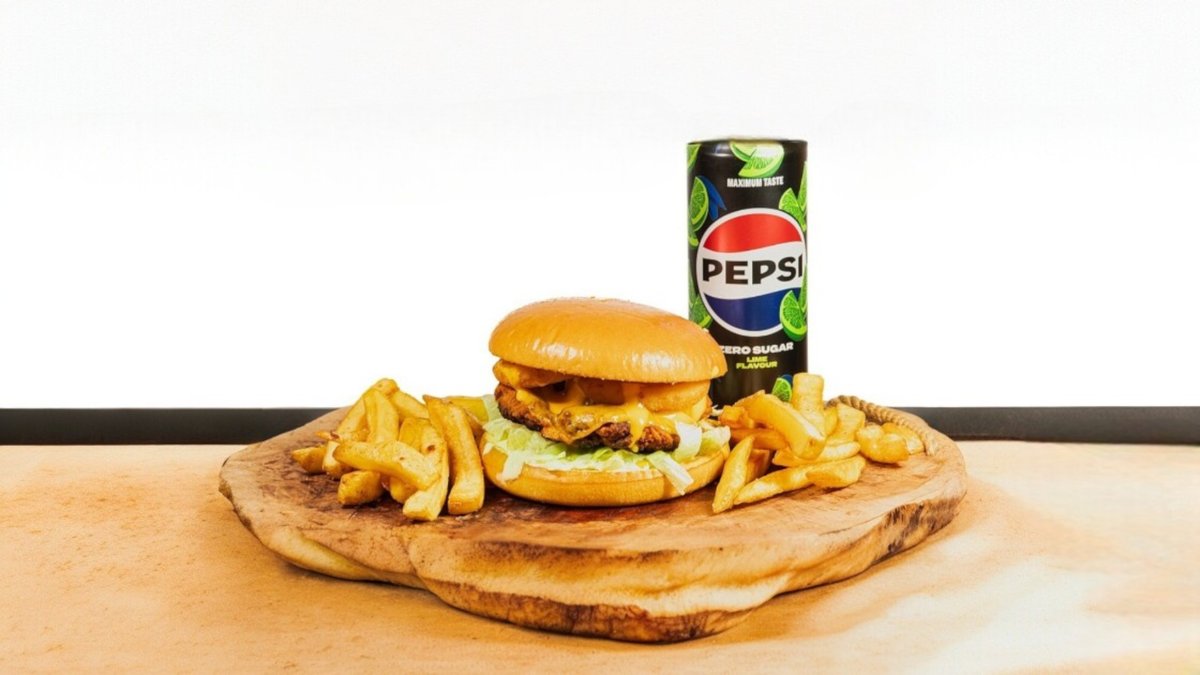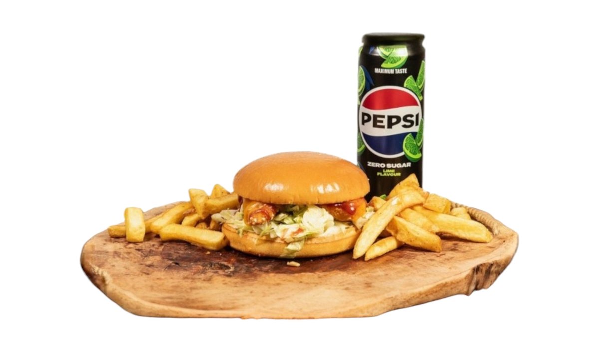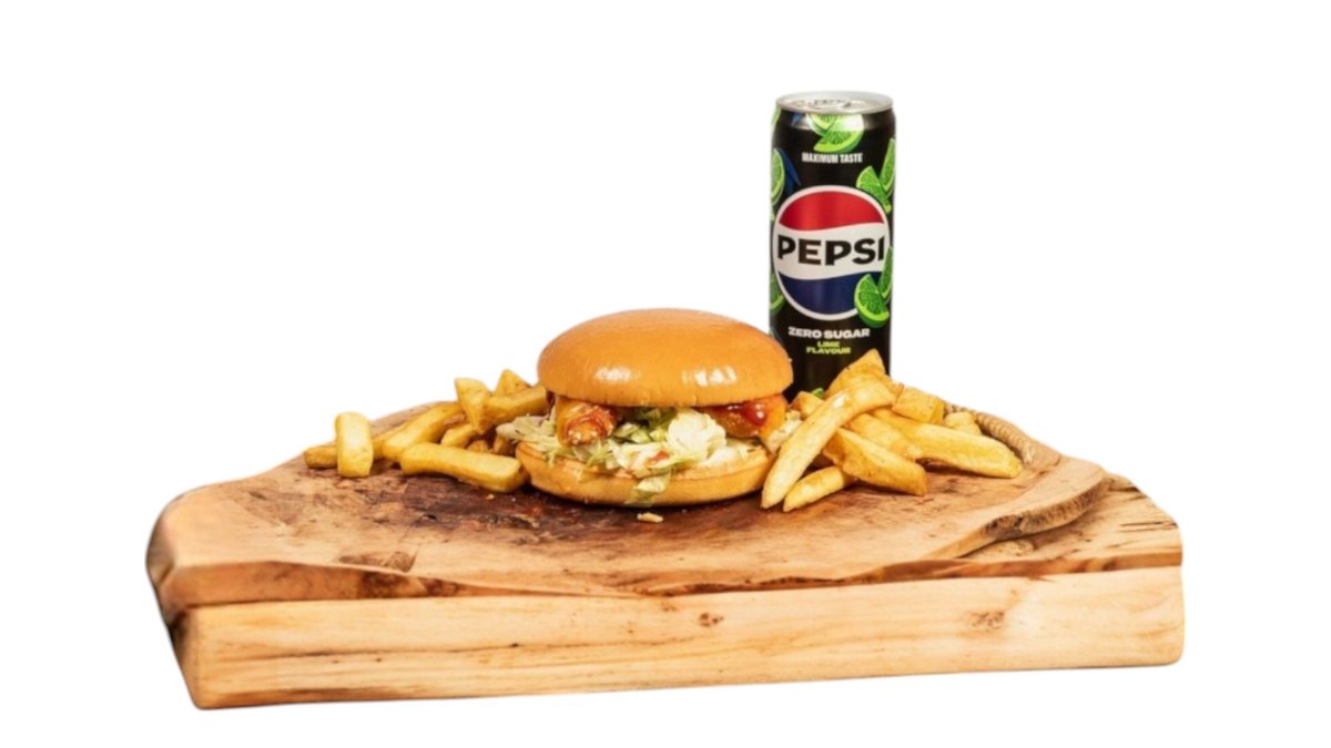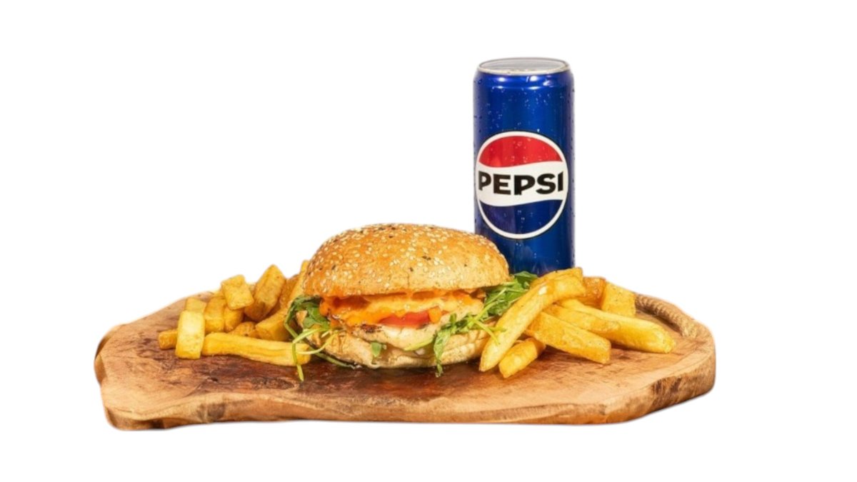 Máslová bulka, hovězí maso, čedar, ledový salát, rajče, majonéza, hranolky, omáčka a nápoj dle výběru