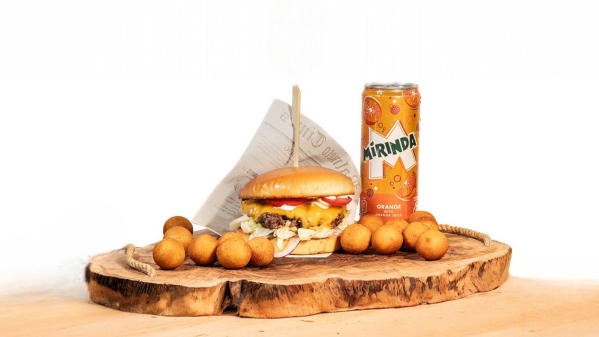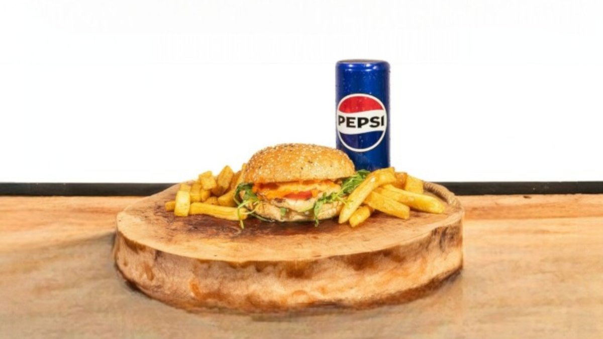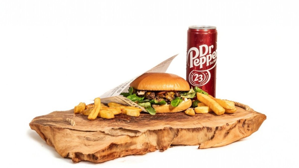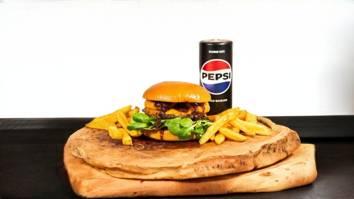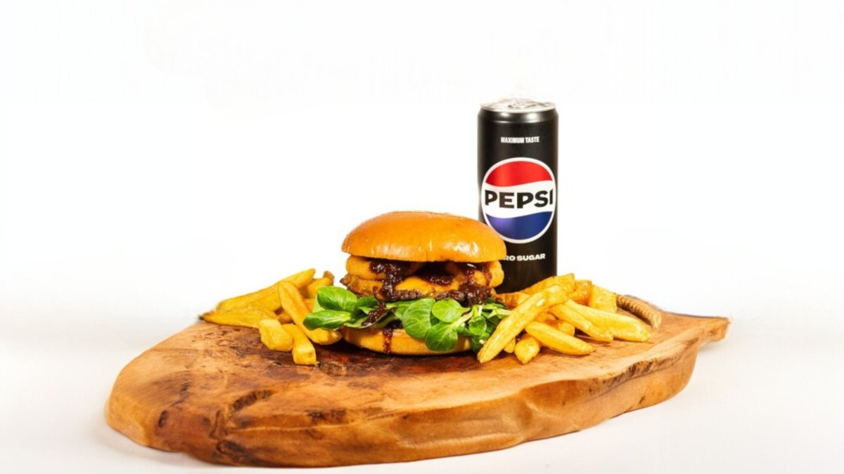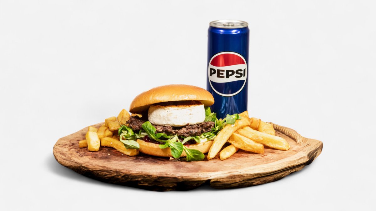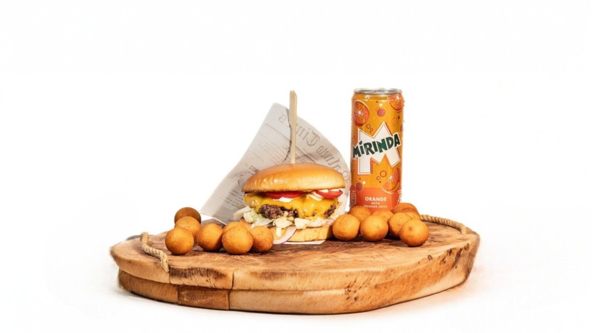 Máslová bulka, hovězí maso, čedar, ledový salát, rajče, majonéza, hranolky, omáčka a nápoj dle výběru