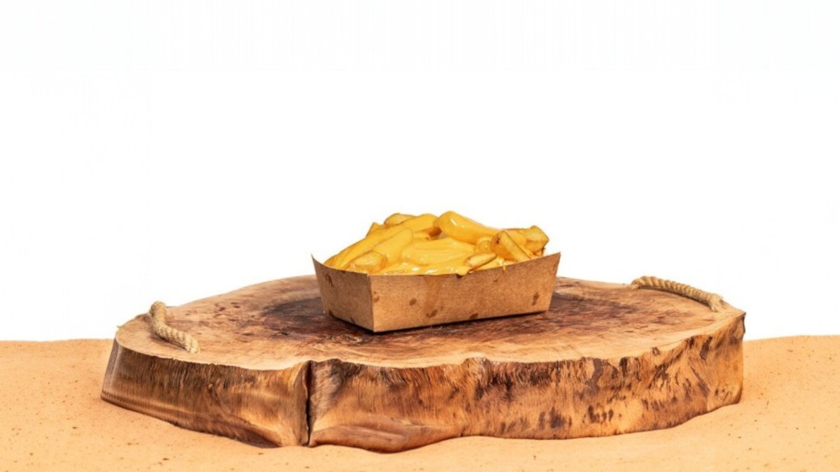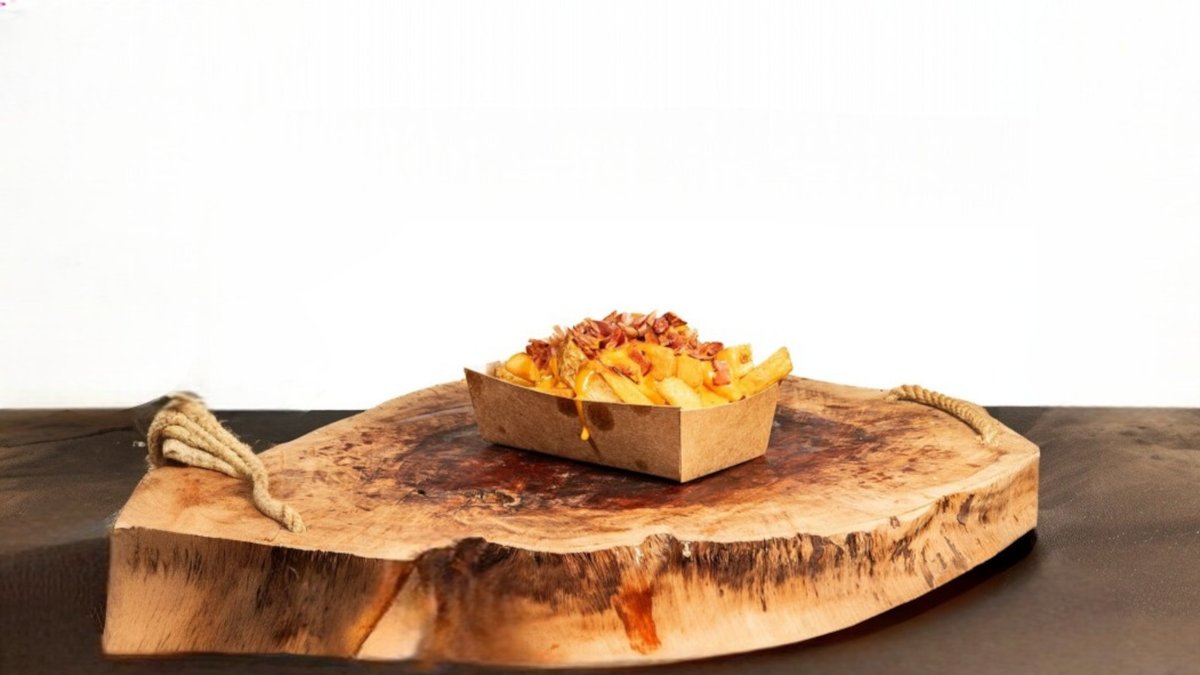 střední hranolky se sýrovou omáčkou a restovanou slaninou