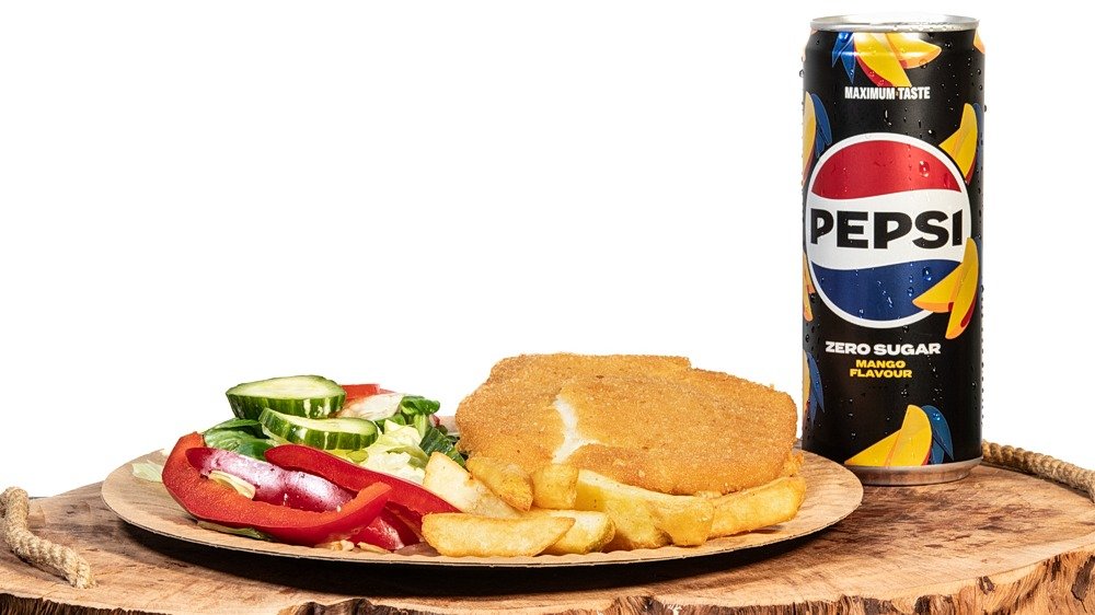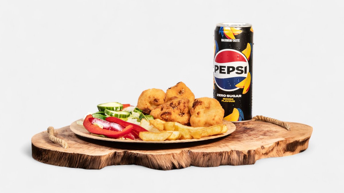 Pikantní stripsy, hranolky, zelenina, omáčka a nápoj dle výběru