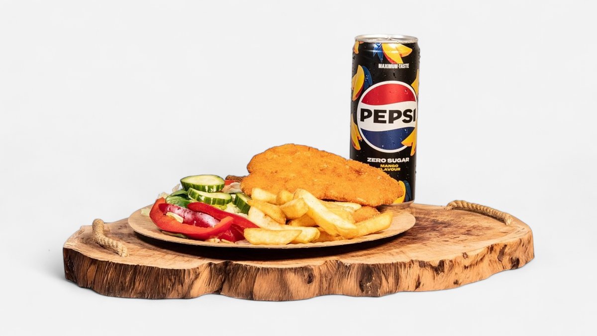 Kuřecí Zizu stripsy, hranolky, zelenina, omáčka a nápoj dle výběru