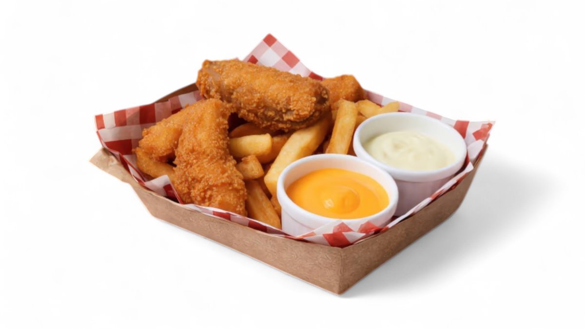 6 ks kuřecích stripsů s hranolkami a dipem chedar a česnek