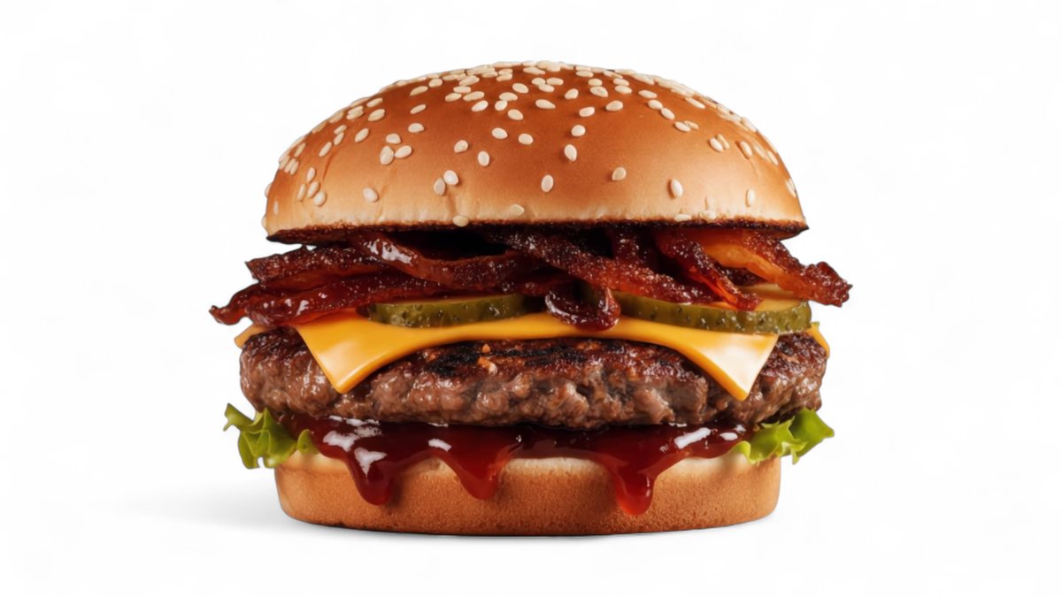 Hovězí maso 150g, ledový sálat, anglická slanina, rajče, BBq omáčka +1
