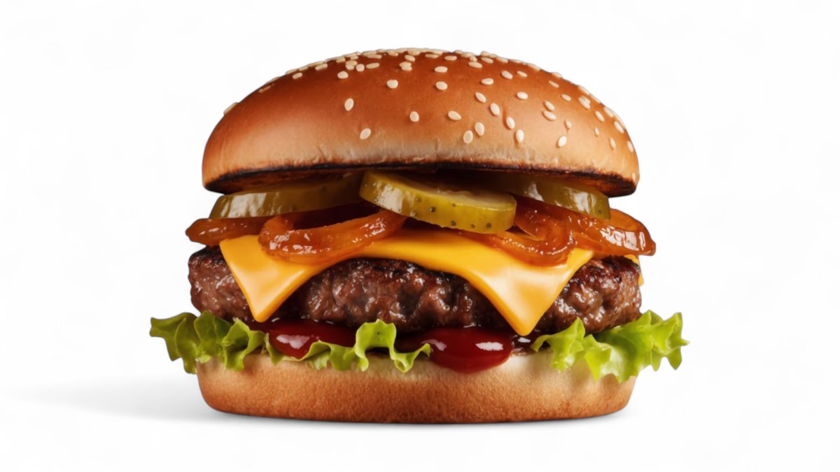 Hovězí maso 2x 300g, ledový sálat, chedar, rajče, karamelizovaná cibulka, anglická slanina, kyselá okurka