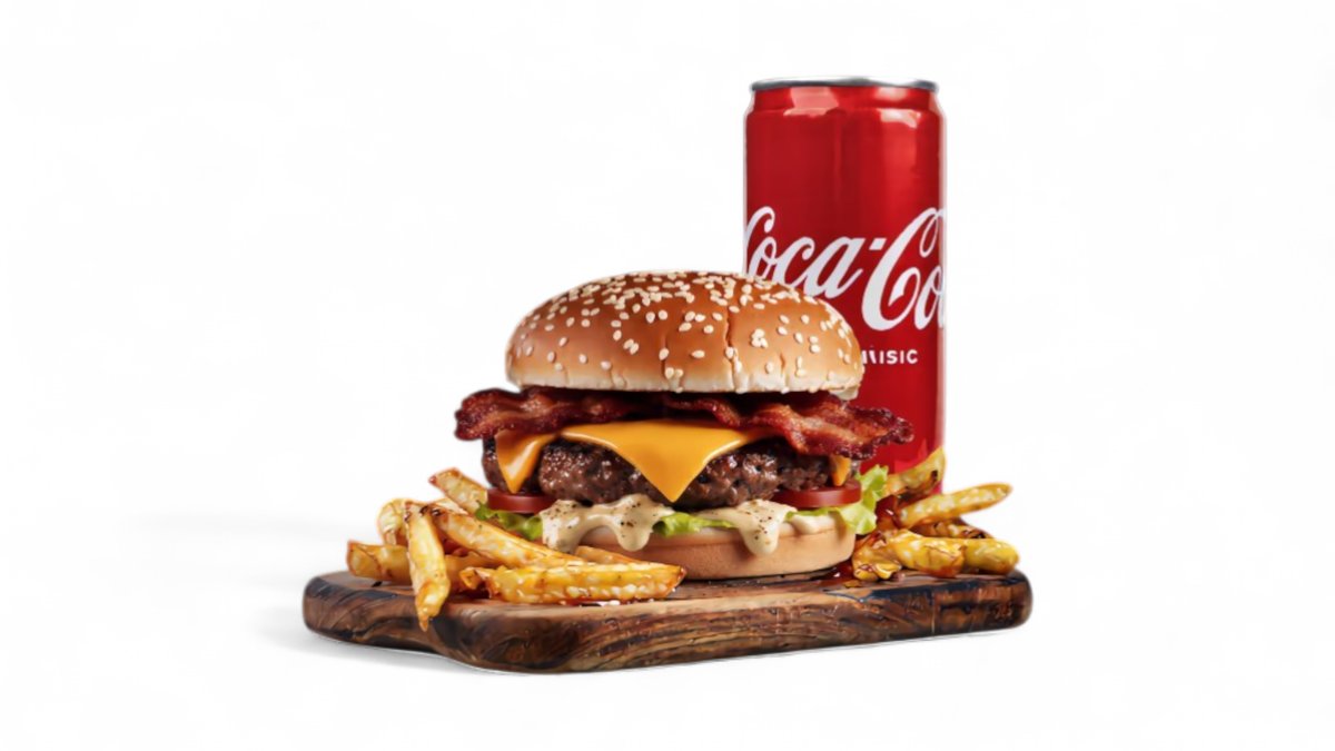 Burger + hranolky + cola v plechu 0,33 ml. Obsahuje: Hovězí maso (150g), slanina, chedar, ledový sálat, rajče, pepřový dresink +4