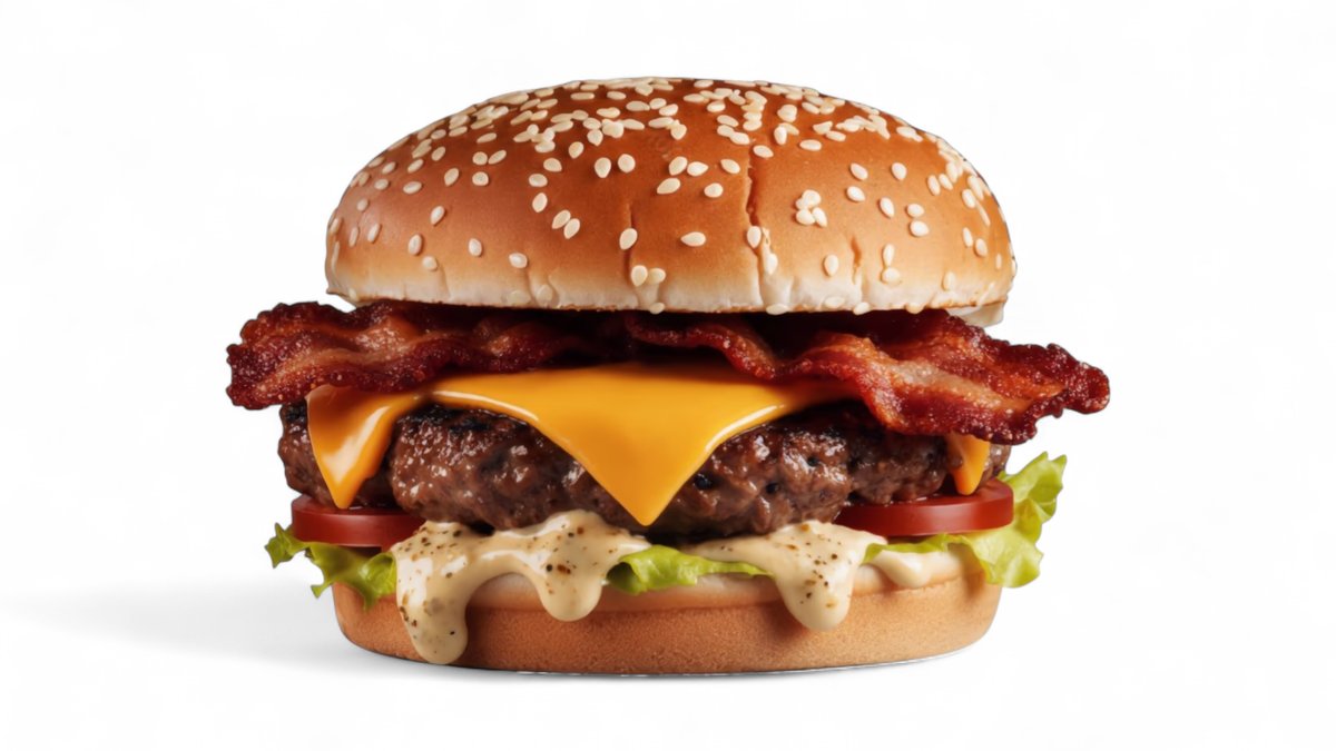 Hovězí maso (150g), slanina, chedar, ledový sálat, rajče, pepřový dresink