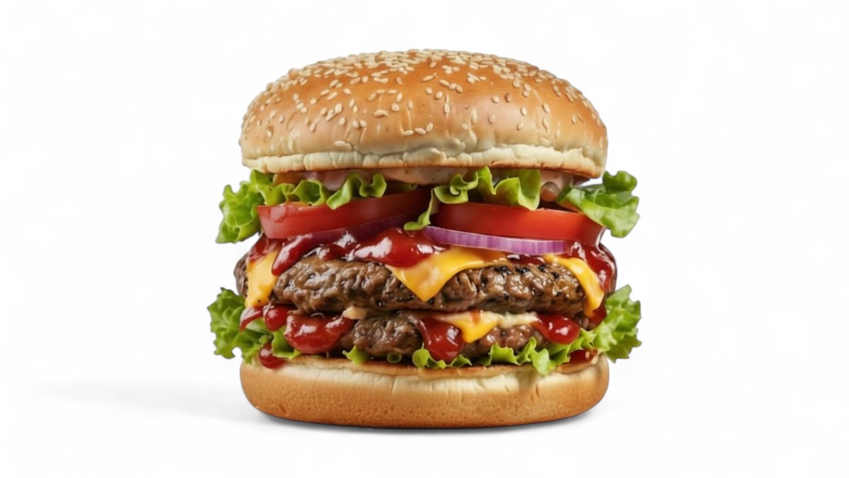 Burger + hranolky + cola v plechu 0,33 ml. Obsahuje: Hovězí maso 2x 300g, ledový sálat, chedar, rajče, karamelizovaná cibulka, anglická slanina, kyselá okurka +4