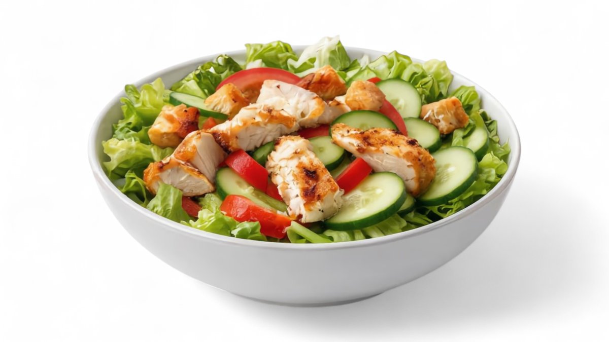 kuřecí maso, ledový sálat, rajče, okurka, paprika, dresink