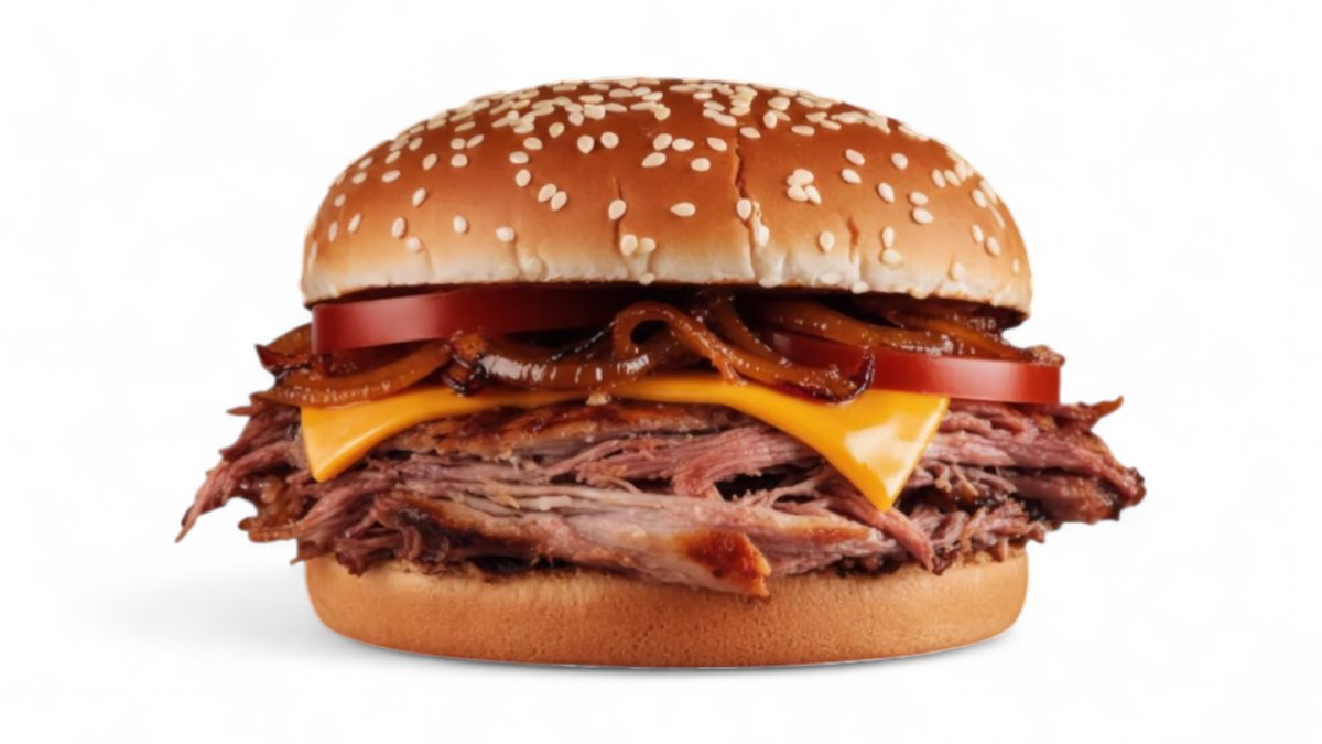 Vepřové maso 150g, rajče, chedar, karamelizovaná cibulka +1