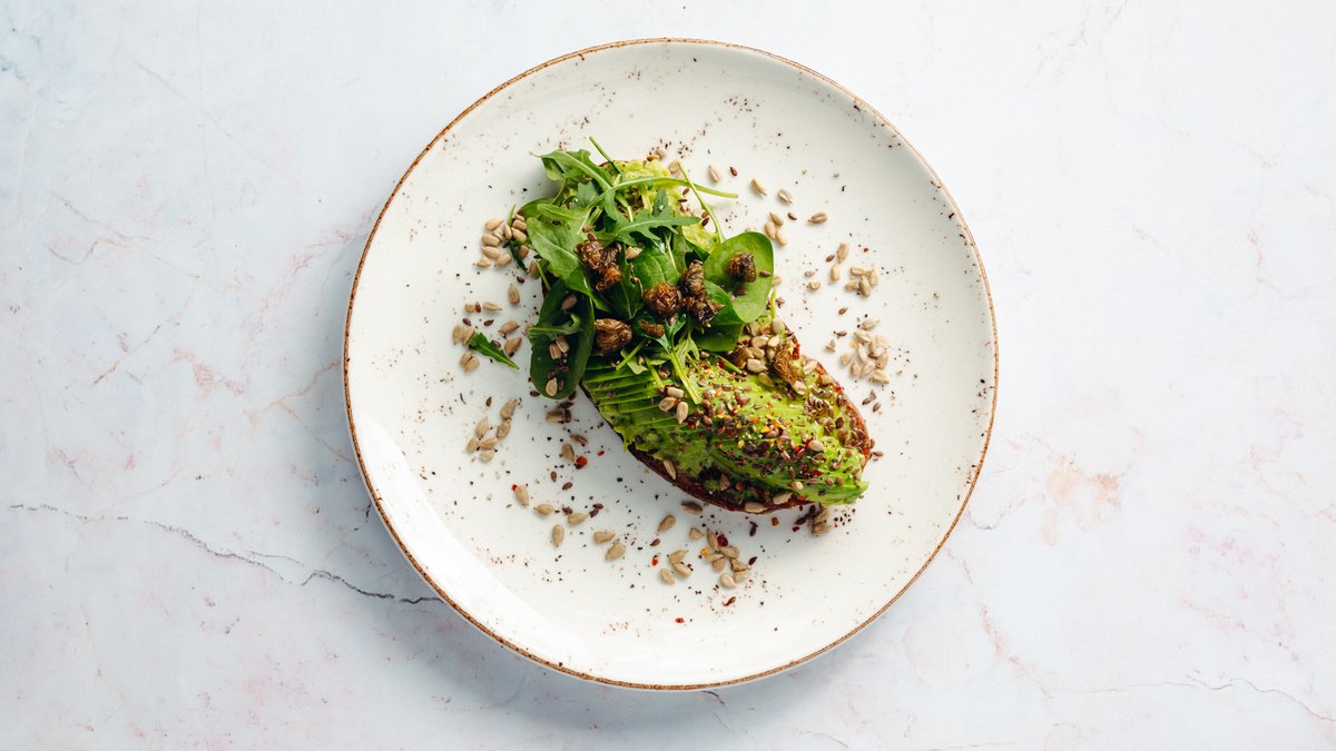 opečený plátek chleba na sucho, cottage sýr, mango chutney avokádo, zastřené čerstvé vejce, chilli paprička, koriandr, černý seznam, olivový olej, limeta (a: 13711)