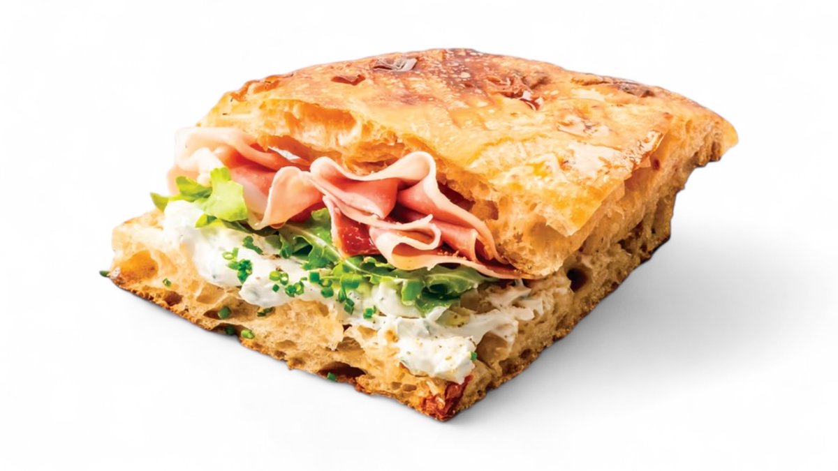 Vláčné pečivo s charakteristicky křupavou kůrkou se šunkou, mozzarellou a rajčatovým pestem. Chuť sendviče podtrhují pečená rajčata a lístky rukoly. Nejlépe chutná rozpečený.