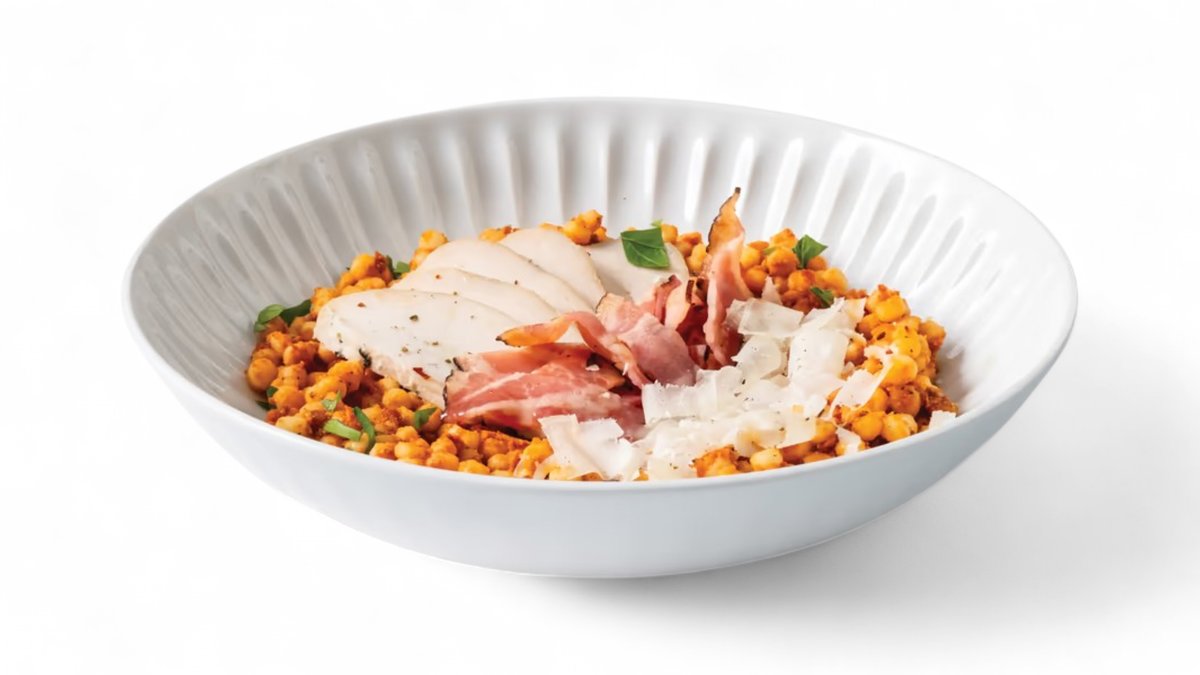 Chuťově výrazný pokrm z tarhoni, drobných těstovin s jemně oříškovou chutí, kousky kuřecího masa, křupavou slaninou a pestem ze sušených rajčat z dílny kuchařů CrossCafe. Jídlo je dochucené krájenými sušenými rajčaty a sýrem Grana Padano. Ideální se hodí jako vydatný a chutný oběd.