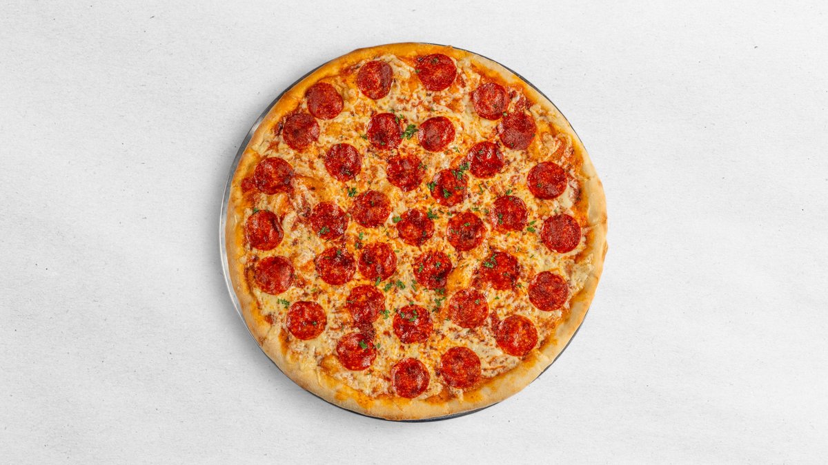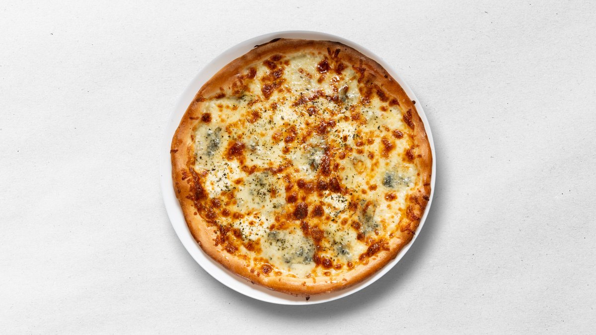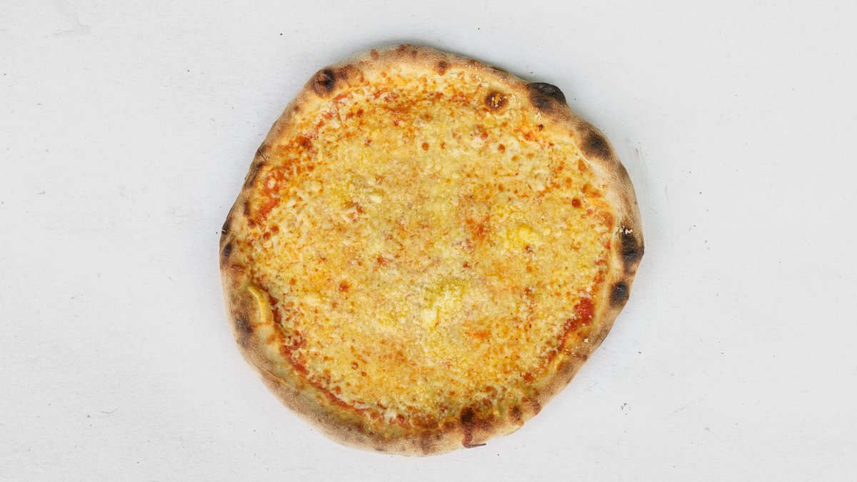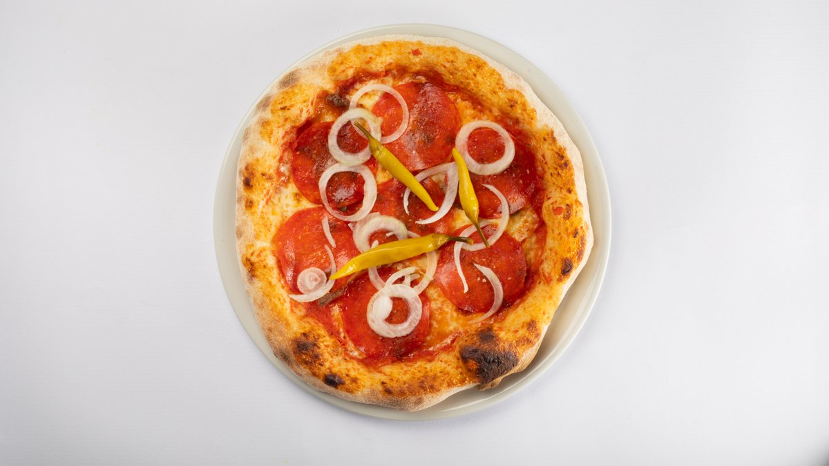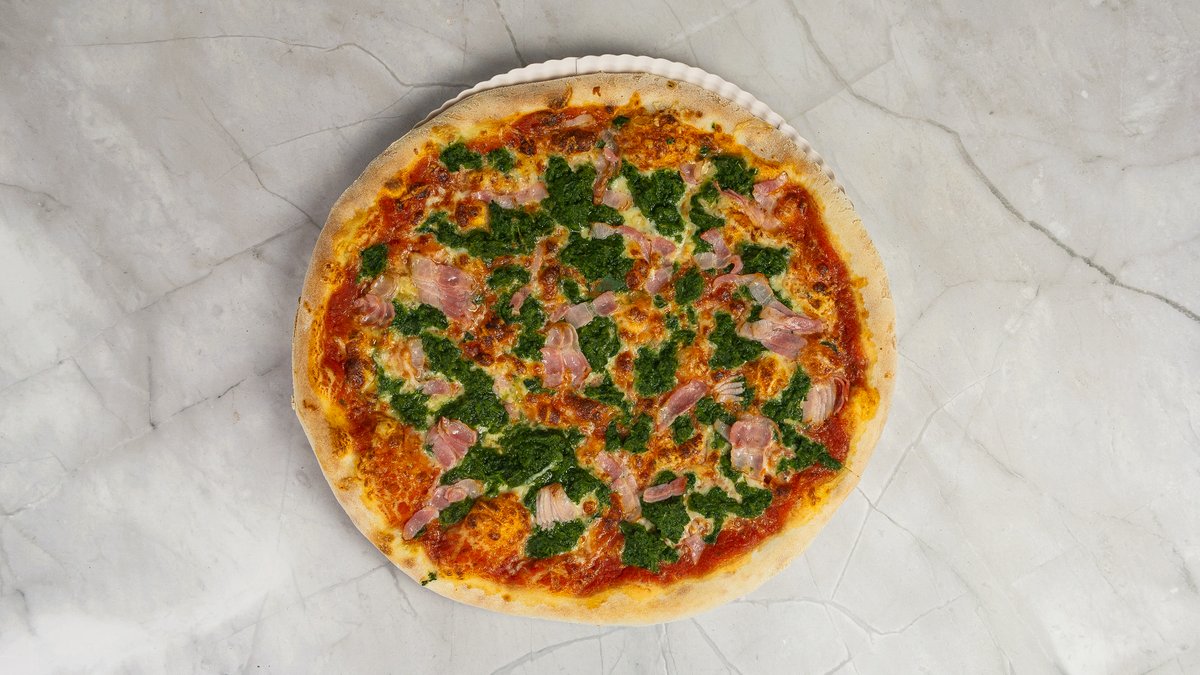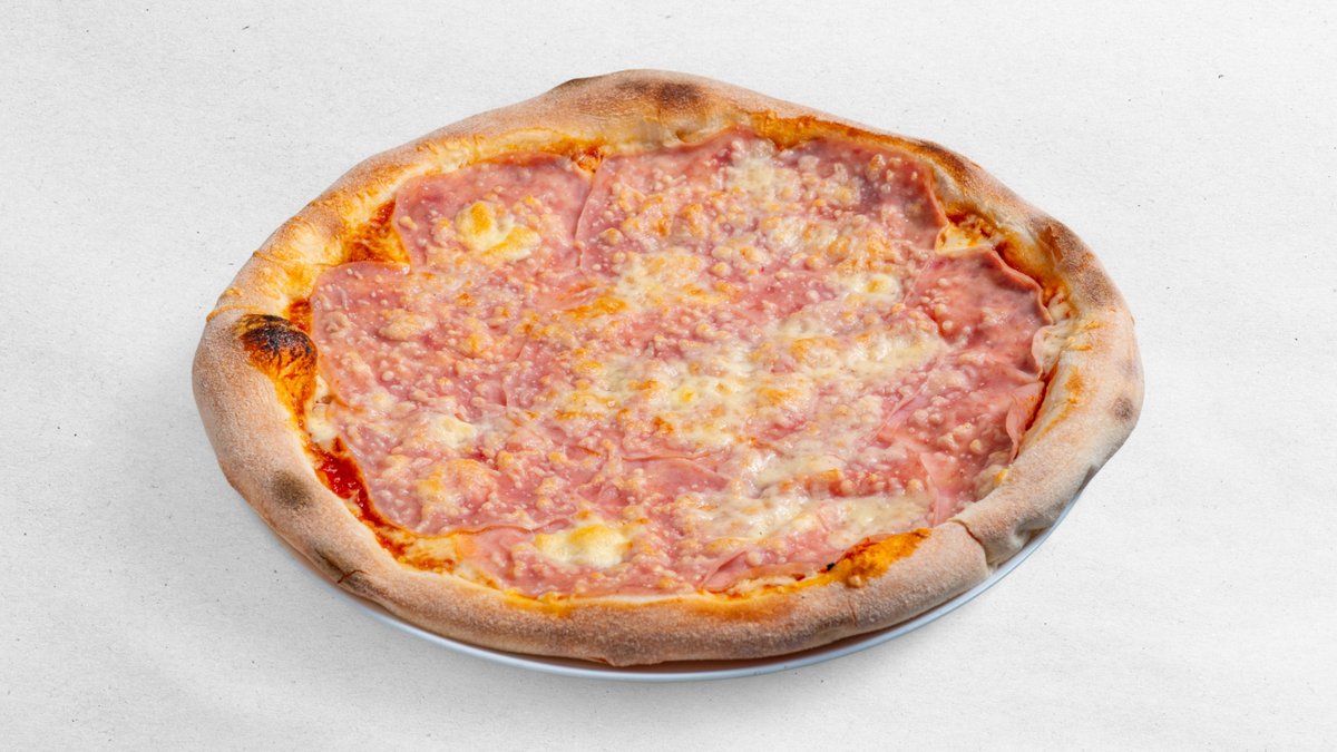 Rajčatový základ, 4 druhy sýra, šunka, olivy, feferonky, žampiony a kukuřice