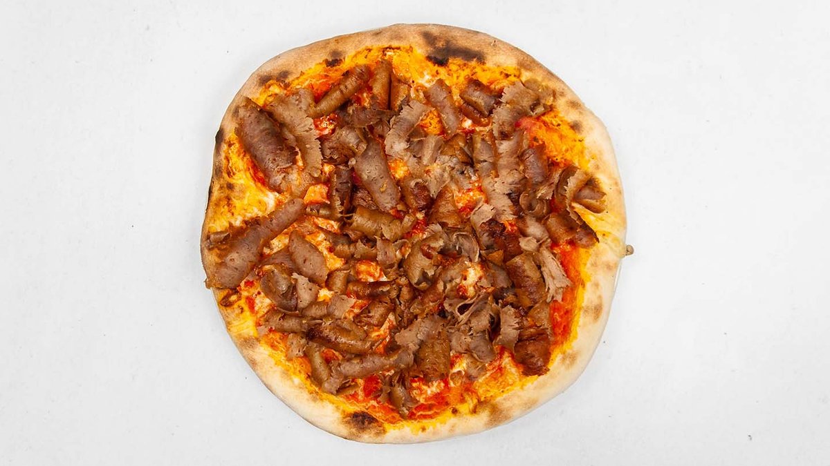 Rajčatový základ, mozzarella, maso kebab a cibule