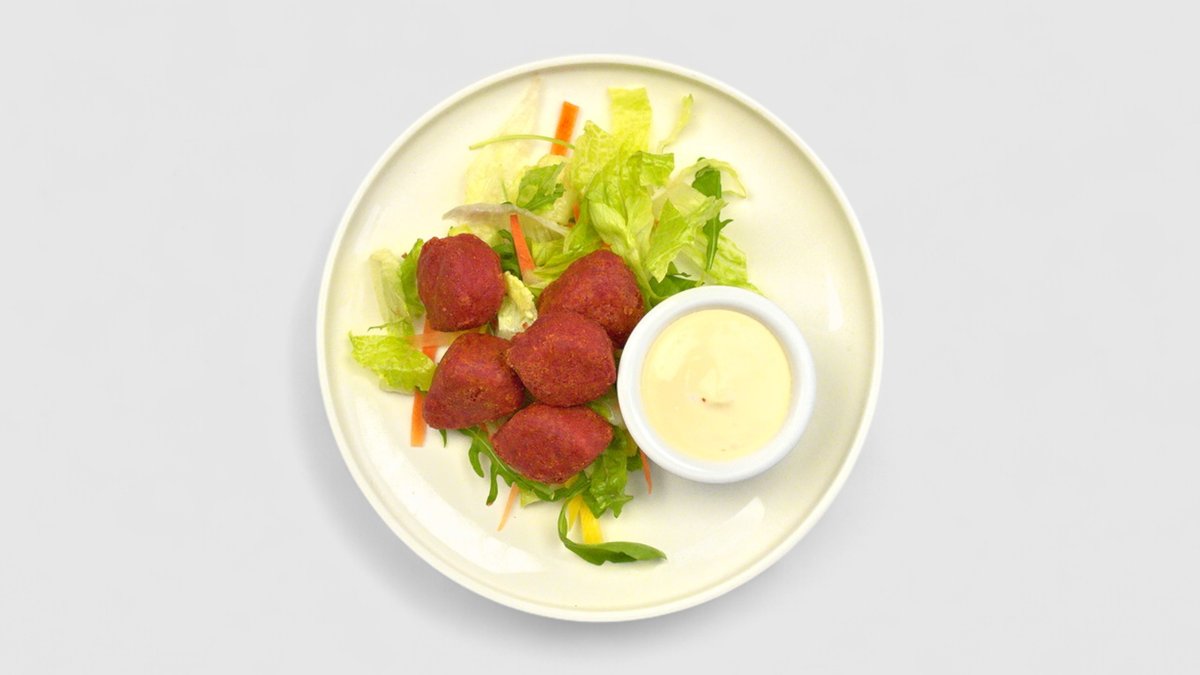 Salát Camembert: čerstvý salát, červená řepa, zelenina, smažený camembert, medovo-hořčičný dressing, sušené brusinky, vlašské ořechy. Bezlepek. (3,7,8,9,10)