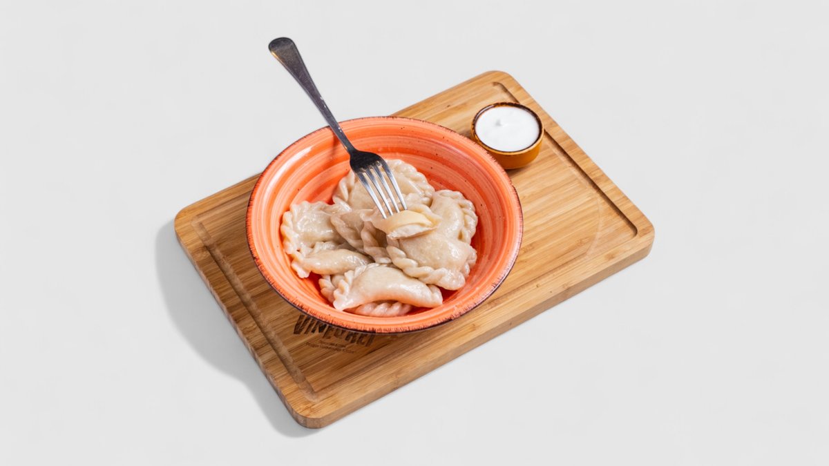 Vareniky se zakysanou smetanou, karamelizovanou cibulkou a bylinkovým olejem. Bramborové (1,3,7) + obal