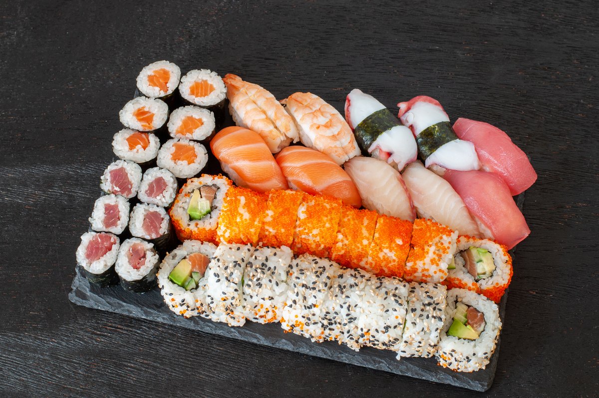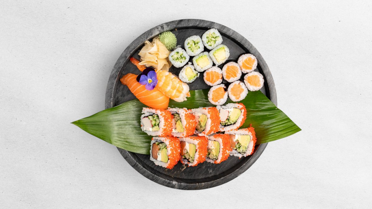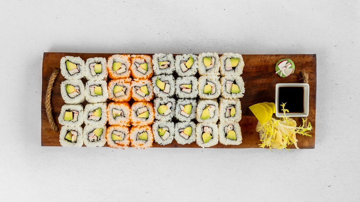 42ks. 2ks nigiri uhor, 2ks nigiri tuňák, 2ks nigiri krevety, 4ks nigiri losos, 8ks avokádo maki, 8ks lososové maki, 8ks California losos a 8ks California kaviár