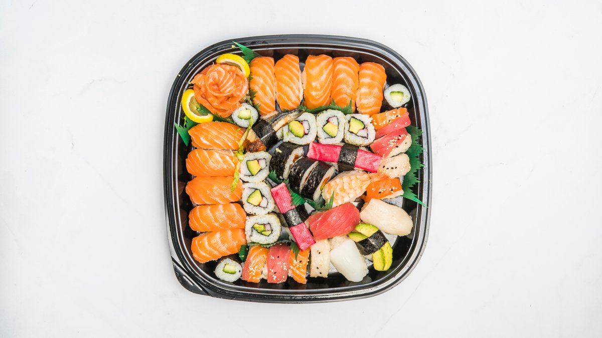 62ks. 8ks okurkové maki, 8ks krabí maki, 8ks lososové, 8ks tuňákové maki, 4ks nigiri losos, 4ks nigiri tuňák, 4ks nigiri krevety, 4ks nigiri úhoř, 4ks California, 4ks sake roll a 6ks sashimi losos