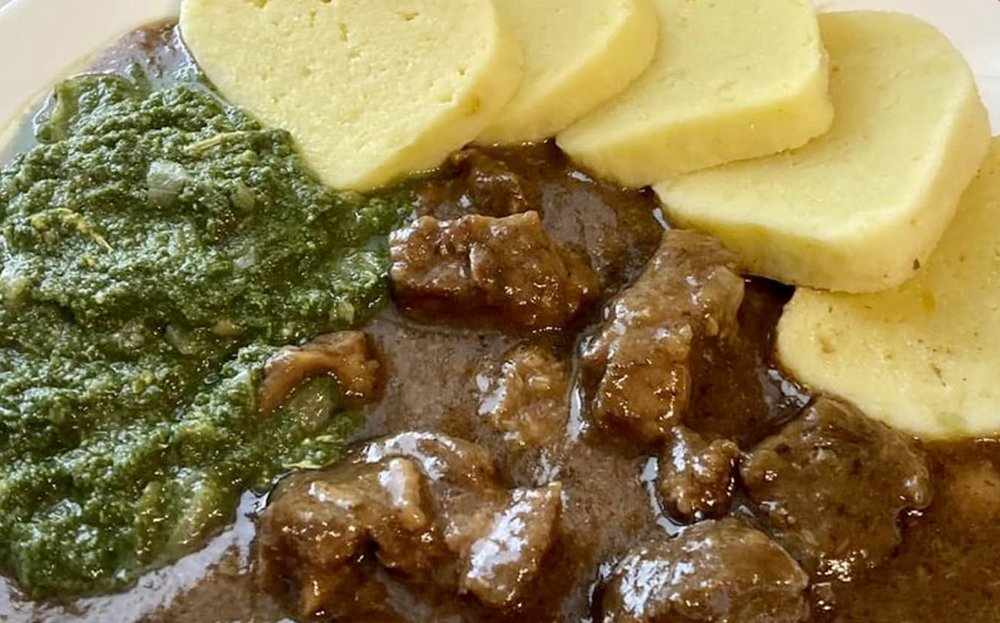150g Hovězí maso na česneku, špenát, domácí bramborový knedlík