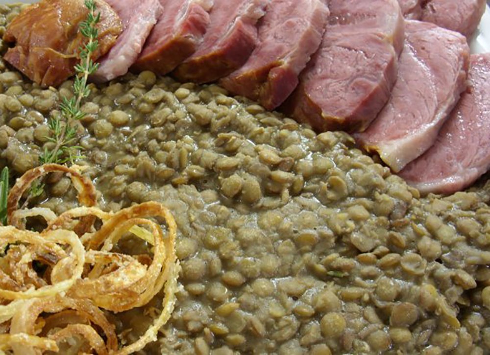 Čočka na kyselo s uzenou krkovičkou, cibulkou a okurkou